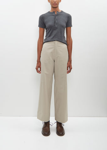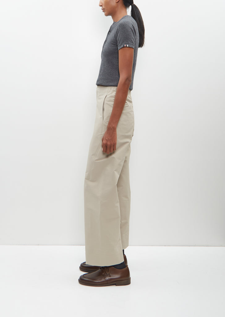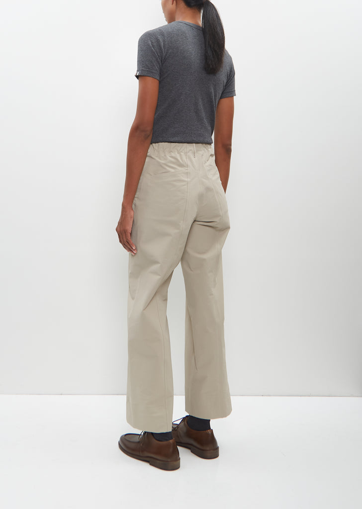 Veilance beige wide leg pant with straight legs and elasticated waist in breathable, wind resistant, water repellent nylon blend. Features front slash pockets, slightly angled back slip pockets, and a concealed double press button and zip-fly closure at front.