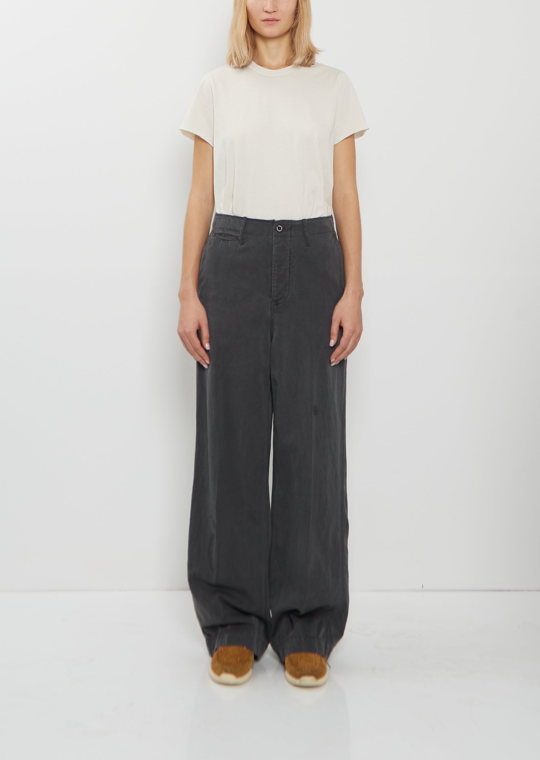 Visvim black high-rise pants with wide, straight legs and distressed embroidered details throughout in a wool and linen blend with a washed and worn effect. Features belt loops, small welt coin pocket at front, angled front pockets, buttoned welt pockets at back, and a button-fly fastening. Finished with branded tonal buttons throughout.