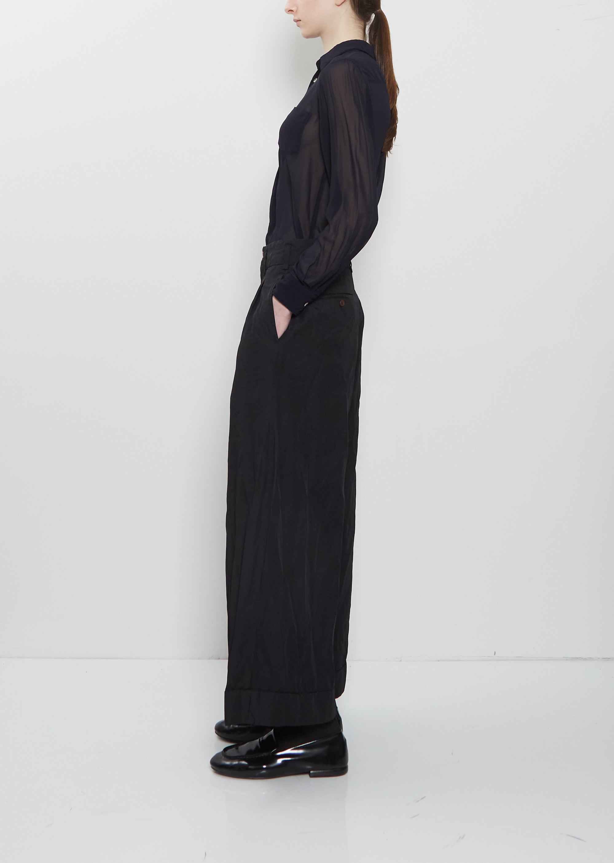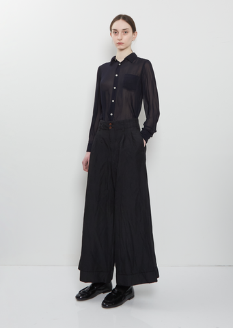 Comme des Garçons Comme des Garçons black  pant with straight, wide legs and a pleated front in technical twill. Features an belt loops, side seam pockets, two welt pockets at back, a two brown button and zip-fly closure at front. Finished with cuffed hems. Relaxed fit.
