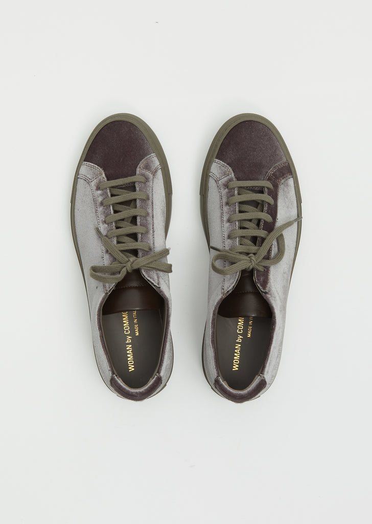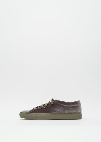 Common Projects brown low-top lace-up sneaker with a round toe in velvet. Fully lined in tonal leather with a padded tongue and leather insole. Finished with tonal cotton laces and signature gold stamped style numbers on outer heel.