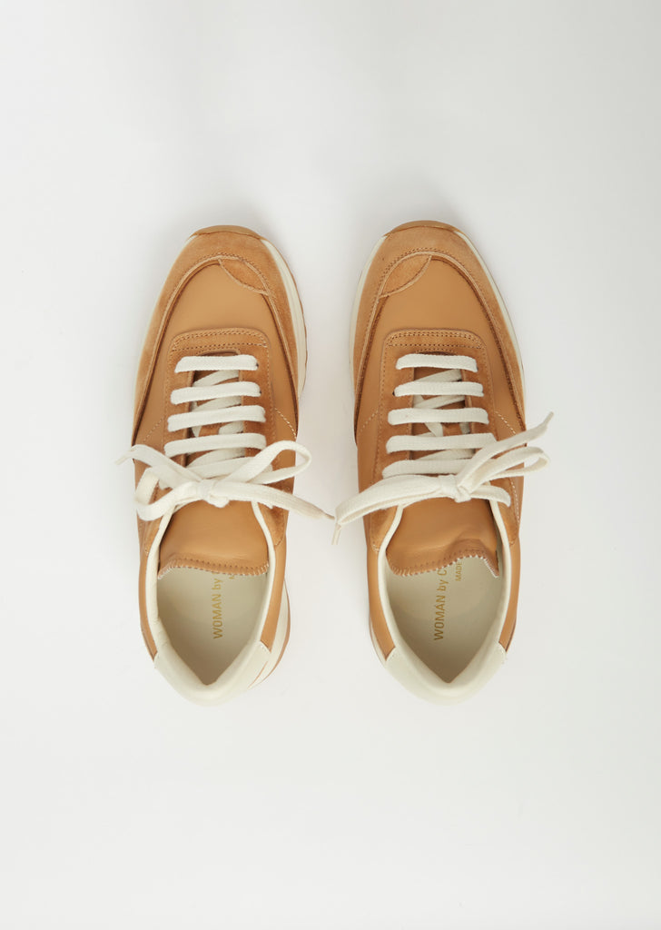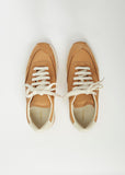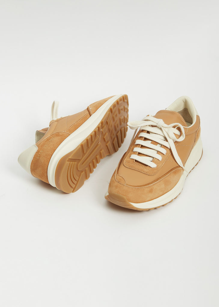 Common Projects retro runner lace-up, low top sneakers with tan suede and leather paneling. Fully lined in off-white leather with an off-white rubber outsole and contrast tan treaded sole. Lightly padded collar and tongue. Signature gold stamped style numbers on side heel. 6-eyelet lace-up construction with contrast off-white laces.