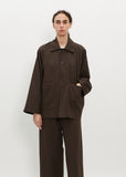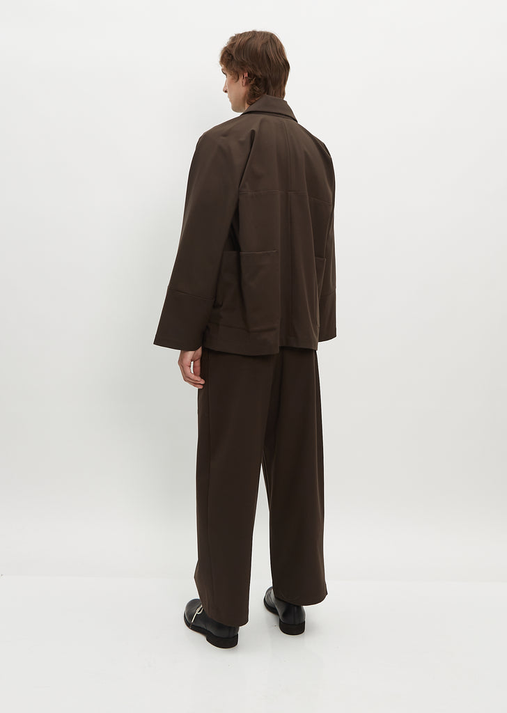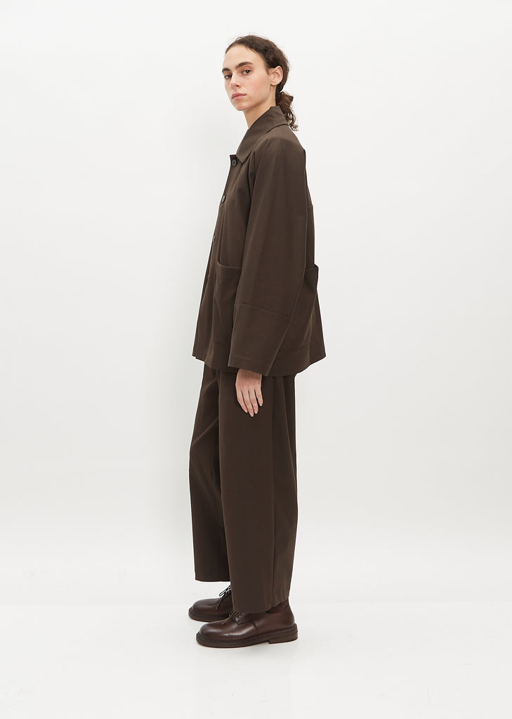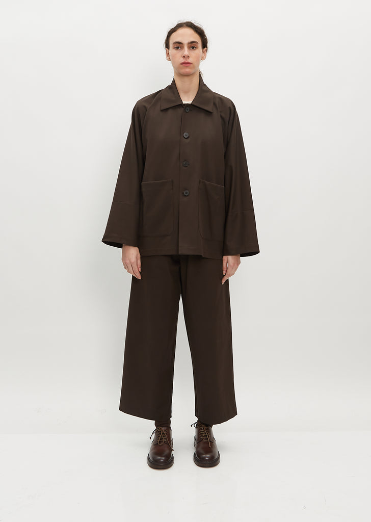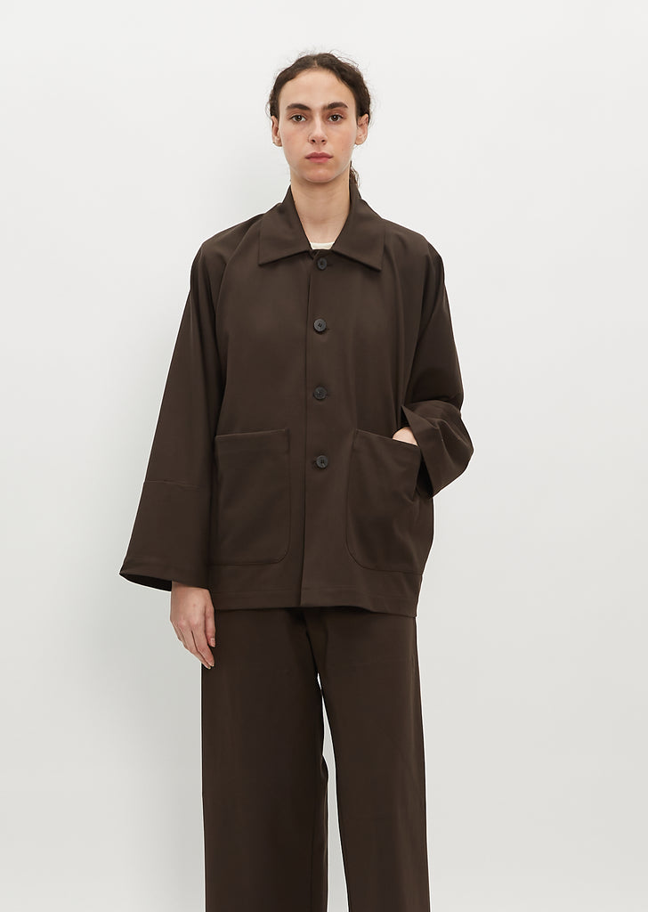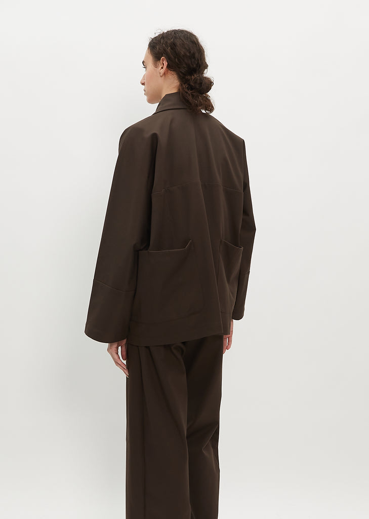 Wright + Doyle clove singe breasted jacket is made without side seams or armholes cut from cotton twill. Features large patch pockets, stitched into three individual pockets either side, a drawn on collar, deep cuffs and four buttons down C. Front.
