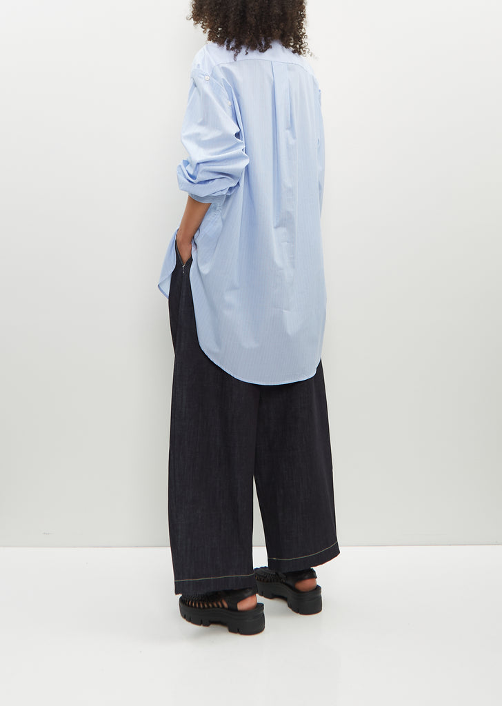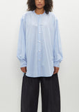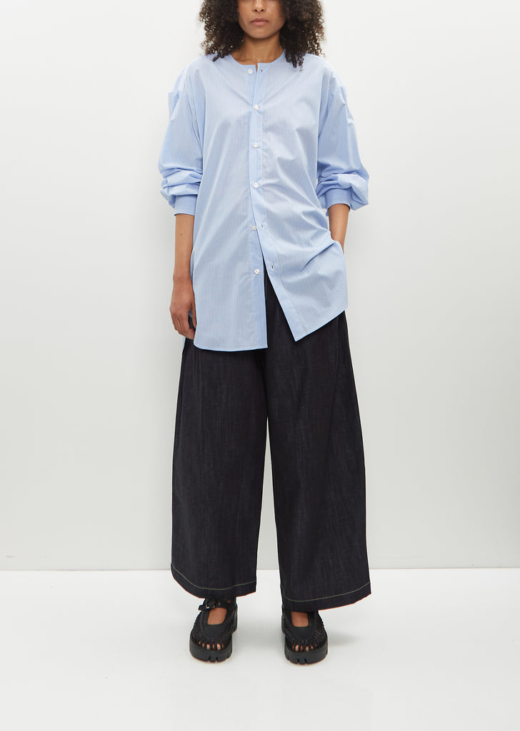 Wright + Doyle light blue fine stripe collarless tunic shirt with a shirttail hem in a lightweight cotton. Features a half buttoned sleeve that can be undone to tie at front. Slightly dropped shoulders, and cuffed pleated sleeves. Oversized fit.