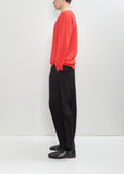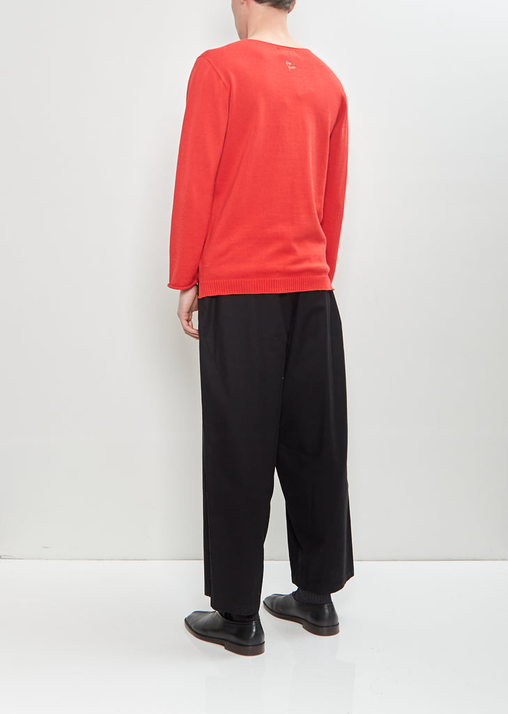 Yohji Yamamoto Pour Homme signature red round neck sweater with white embroidered logo at back in cotton cashmere blend knit. Features rolled finish at cuffs, split side hems, and ribbed trim finish at hem.