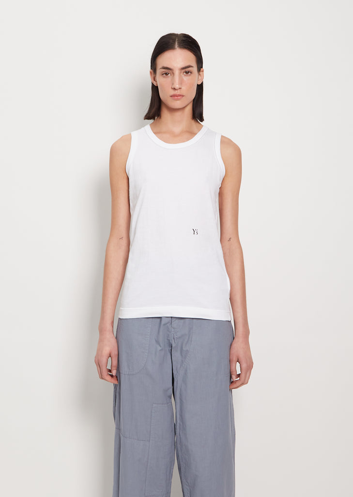 Y's by Yohji Yamamoto off-white tank with a scoop neckline in cotton jersey. Features small embroidered logo on front. Finished with clean wide trim along neck, arms, and hem.
