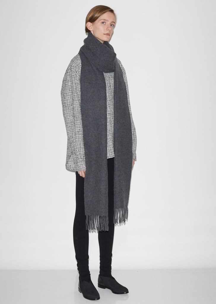 Extra-long rectangular scarf crafted from a soft black virgin-wool blend. Self-fringed ends. Textile logo patch at corner.