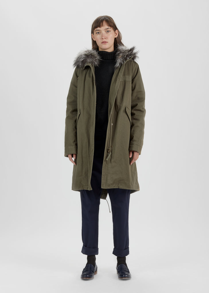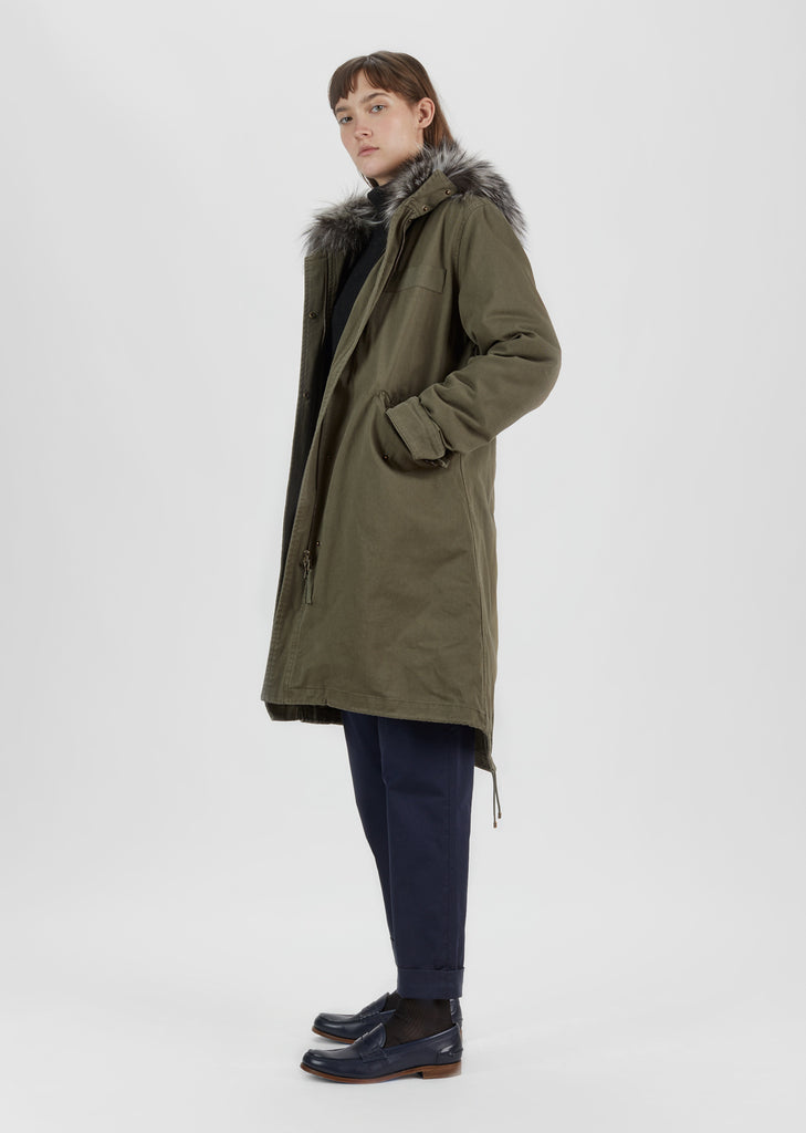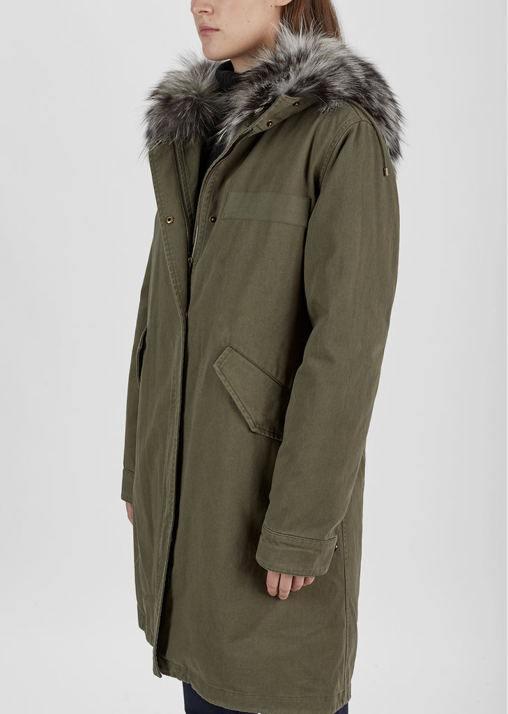 Green down-filled cotton canvas jacket with a fully detachable fox fur collar at the hood. Straight fit. Adjustable internal drawstring at the back waist and bottom hem. Concealed zipper with additional snap closure. Front flap pockets. Tonal quilted sleeve lining. Color: Hunter Green. 100% Cotton; Hood Trim: 100% Marmotte, 100% Fox; Padding: 80% Duck Down, 20% Duck Feather; Lining: 100% Polyester. Made in France.