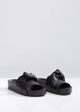 Black leather slides topped with an origami-inspired knot. These sleek sandals are set on a 2" leather platform, with a slightly molded sole for extra support. Platform height: 2". Color: Black. 100% Leather. Made in Italy.