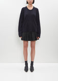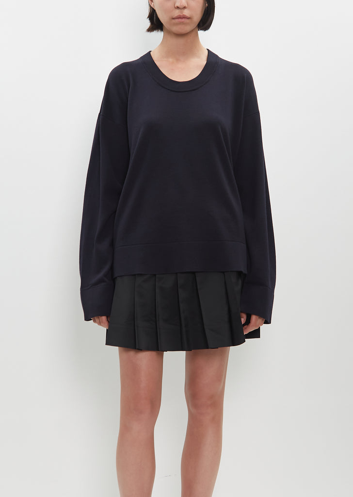 Fforme navy long sleeve sweater with a scoop neckline in soft and lightweight merino wool. Features dropped shoulders and a rib trim neck, cuffs, and hem. Slightly oversized fit.