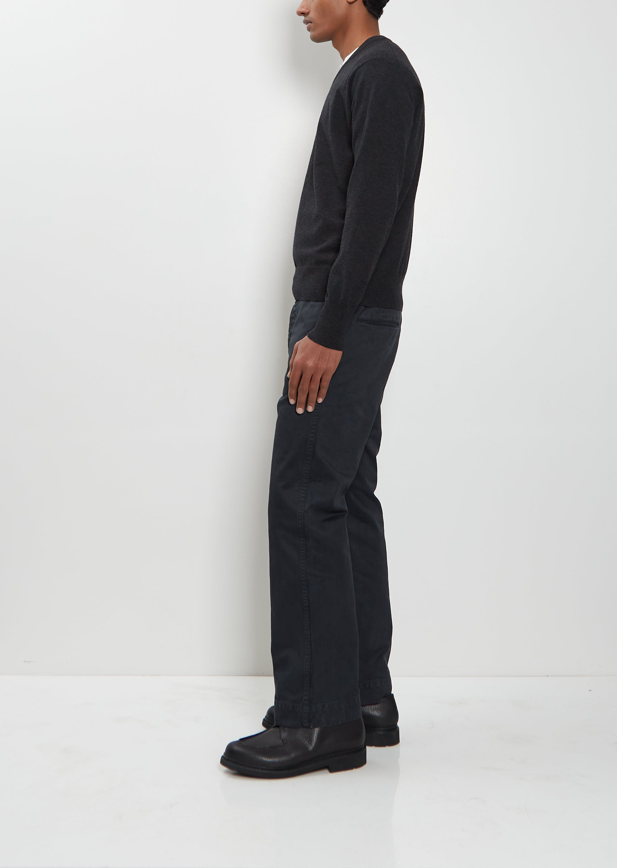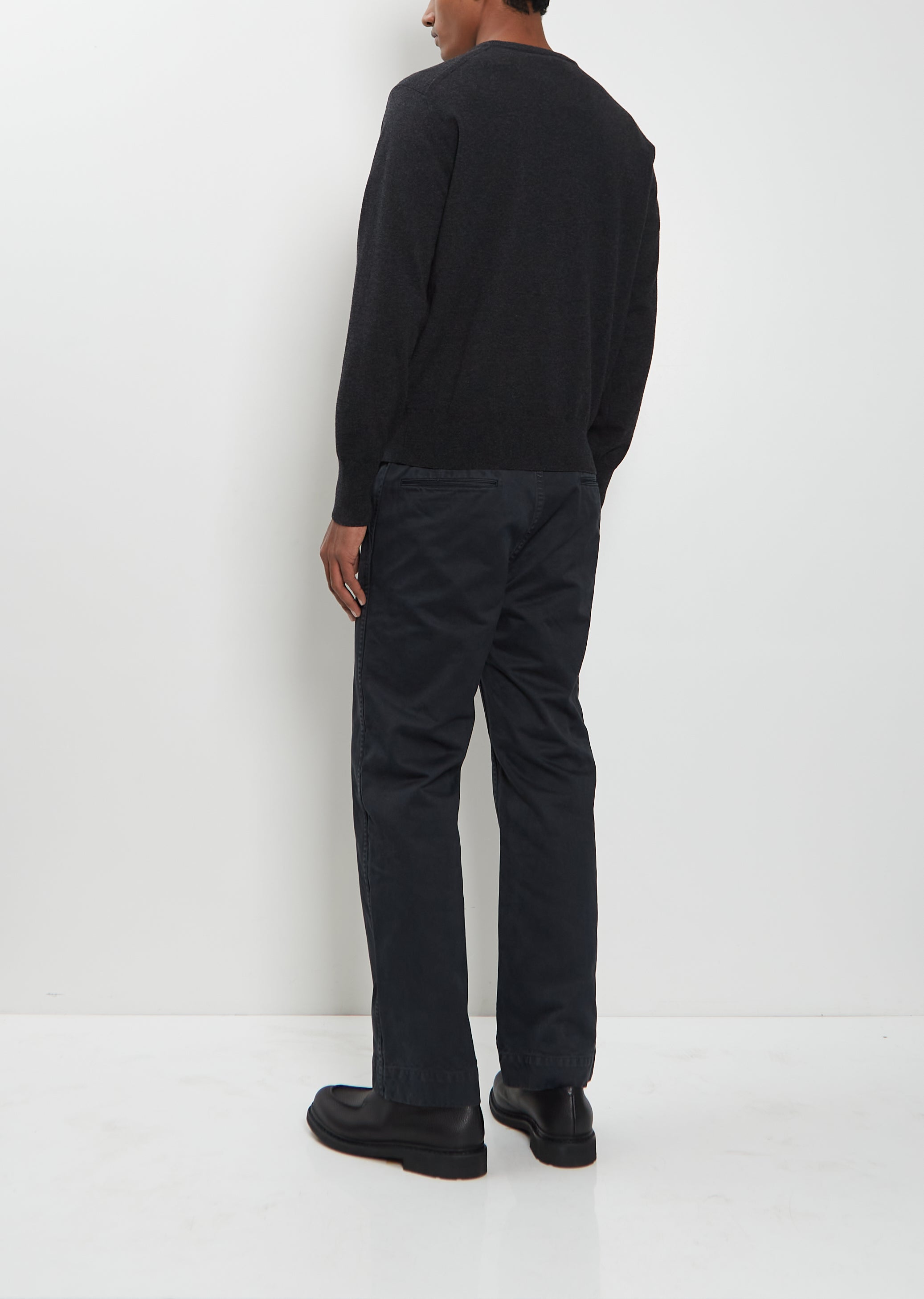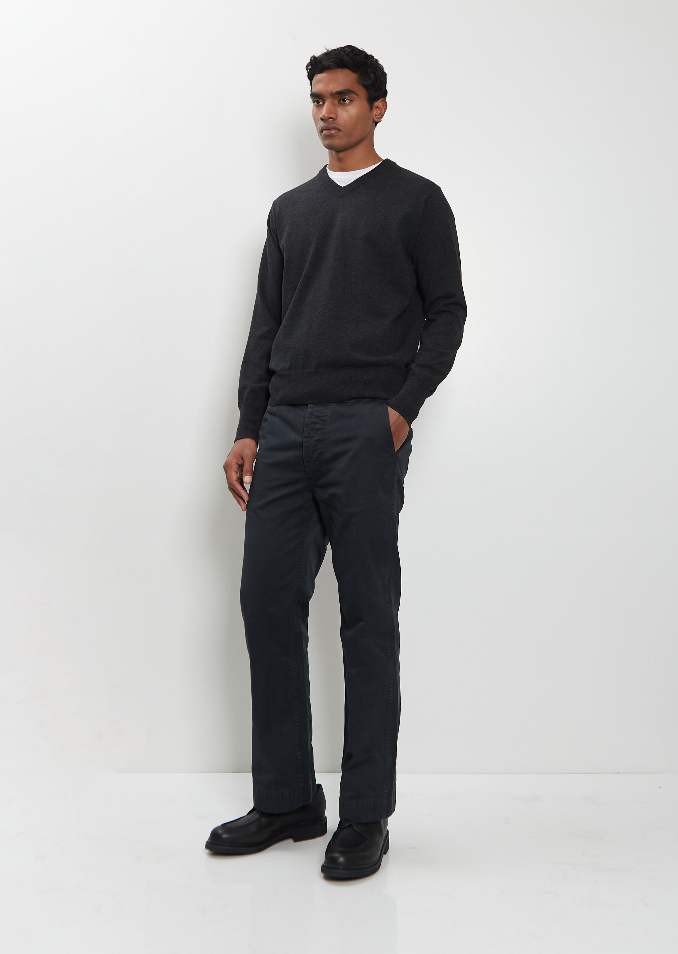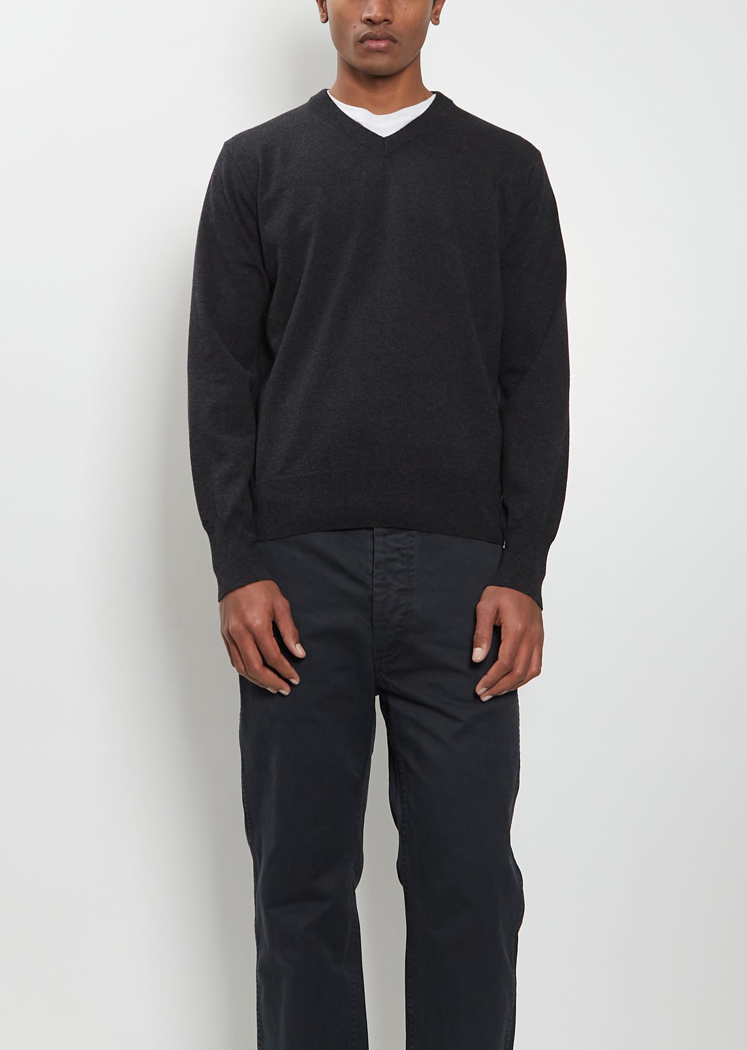 Auralee charcoal grey sweater with a V-neck and slightly dropped shoulders crafted from ultra-fine wool knit. Features ribbed trim finishings at neck, cuffs and hem. Relaxed fit.
