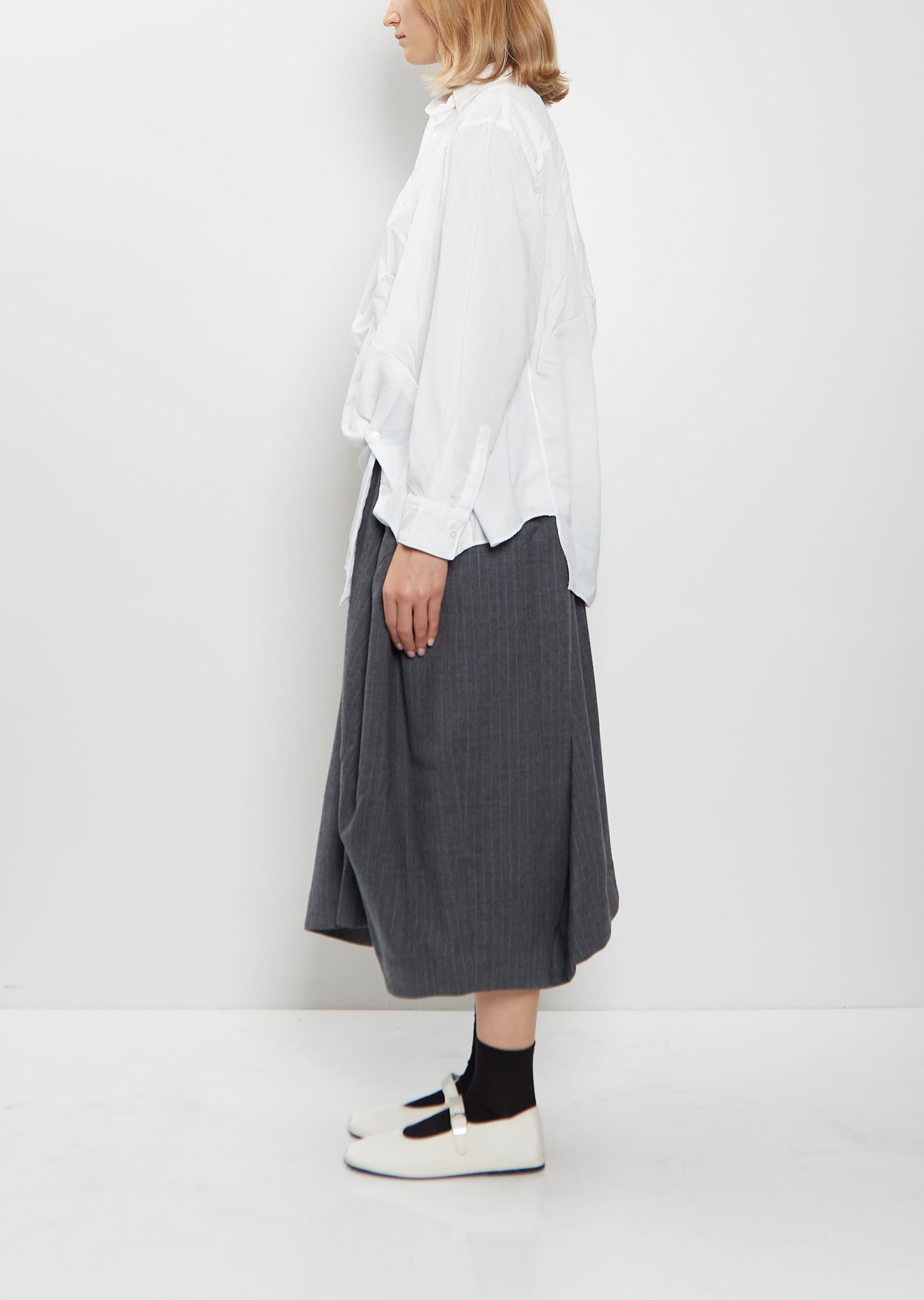 Comme des Garçons white asymmetrical shirt with a voluminous construction throughout in lightweight polyester. Features a classic collar, dropped shoulders, buttoned cuffs, and shell-hued buttoned front.