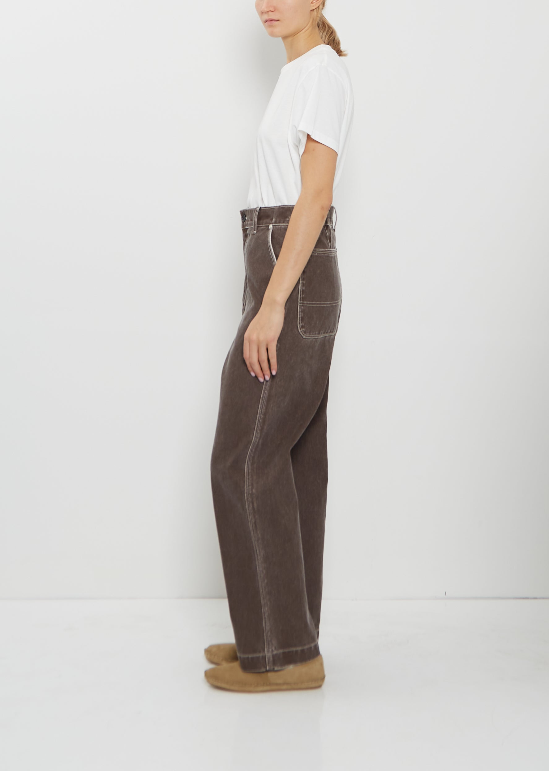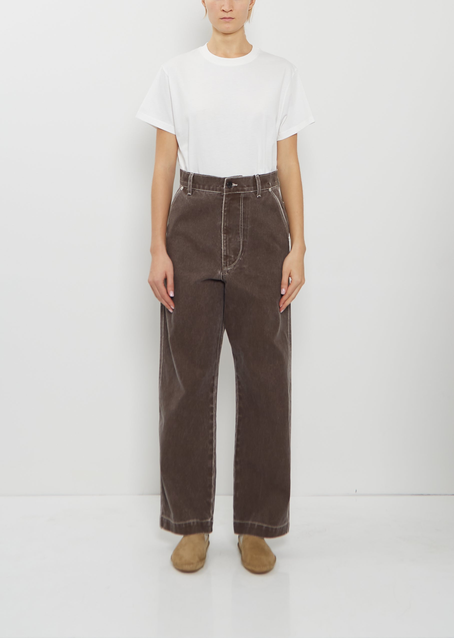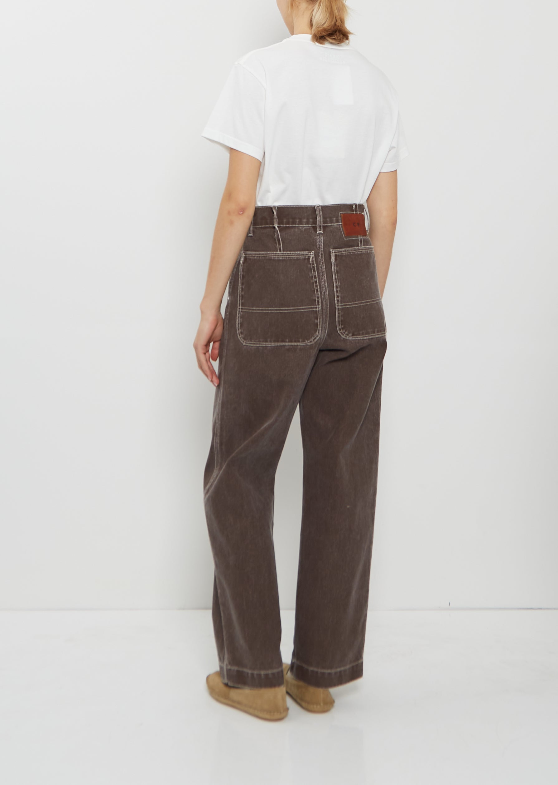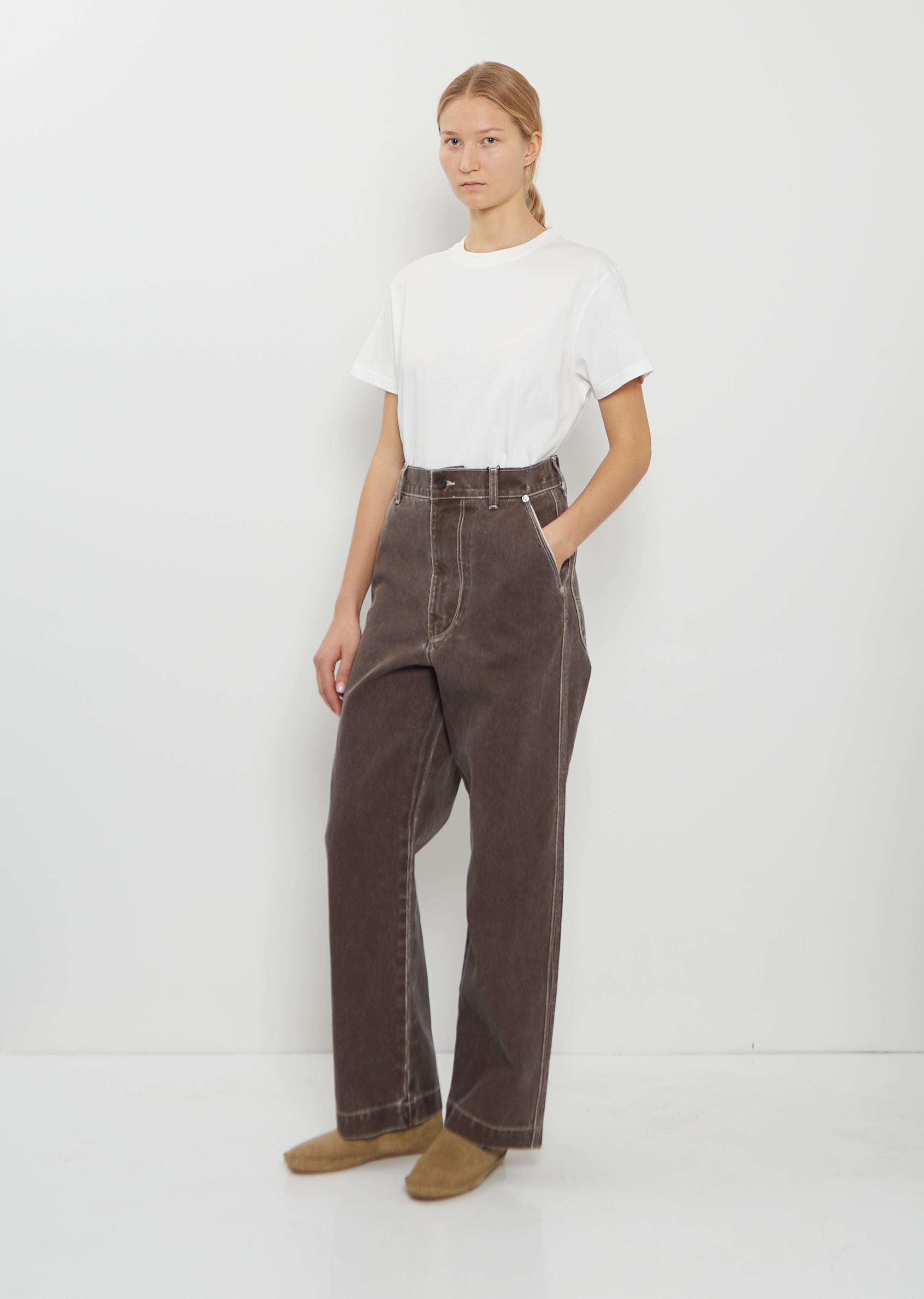 Camiel Fortgens brown jeans with straight legs in dense cotton denim with a washed finish. Features belt loops, angled pockets at sides, deep patch pockets at back, and a horn button and zip-fly fastening. Finished with contrasting white topstitching and silver-hued hardware.