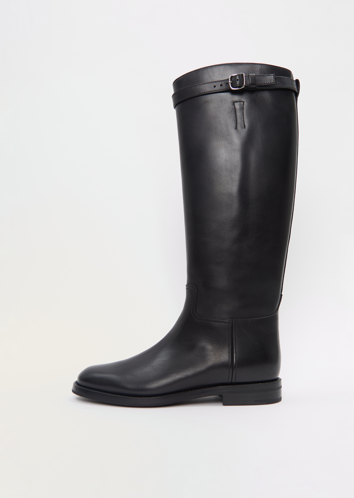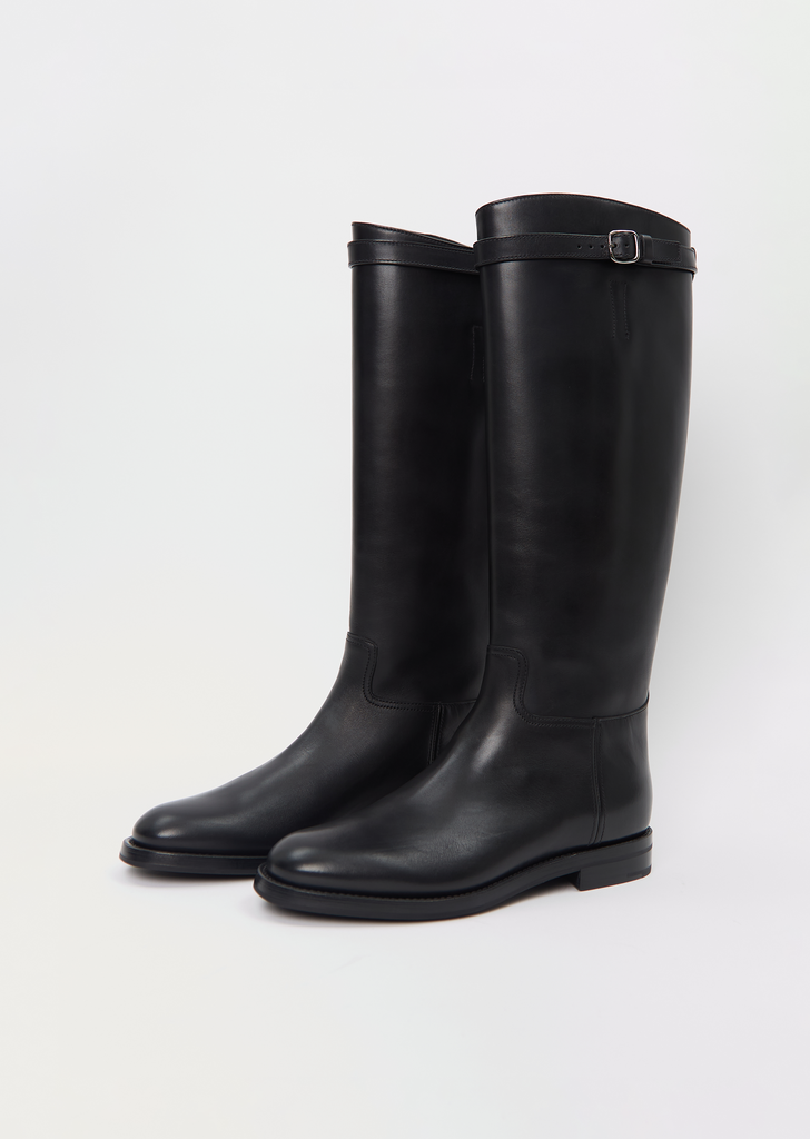 Church's black knee-high pull-on boot with a silver buckle detail in smooth calf leather with a polished finish. Features a round toe, pull tab at back, a branded insole and rubber sole. Lined in leather.