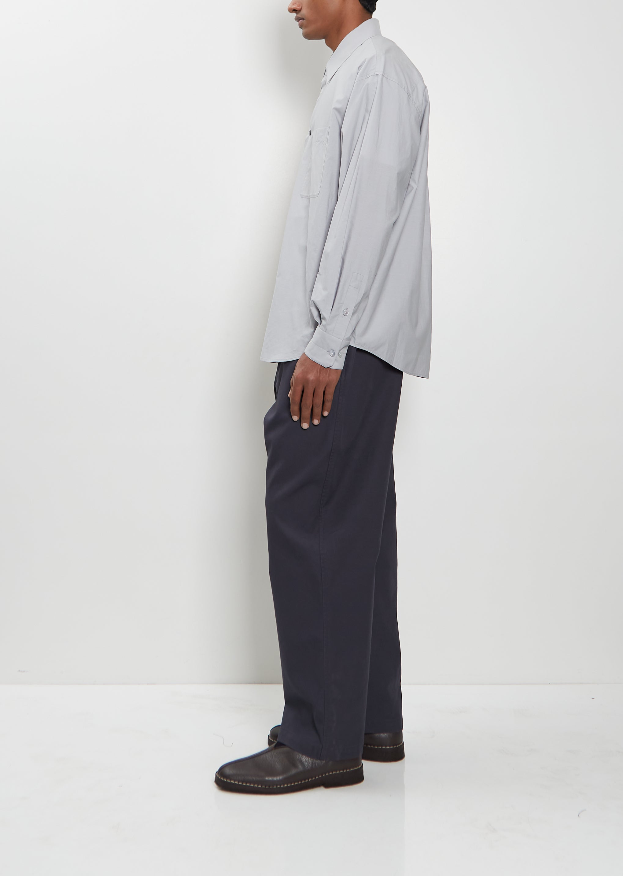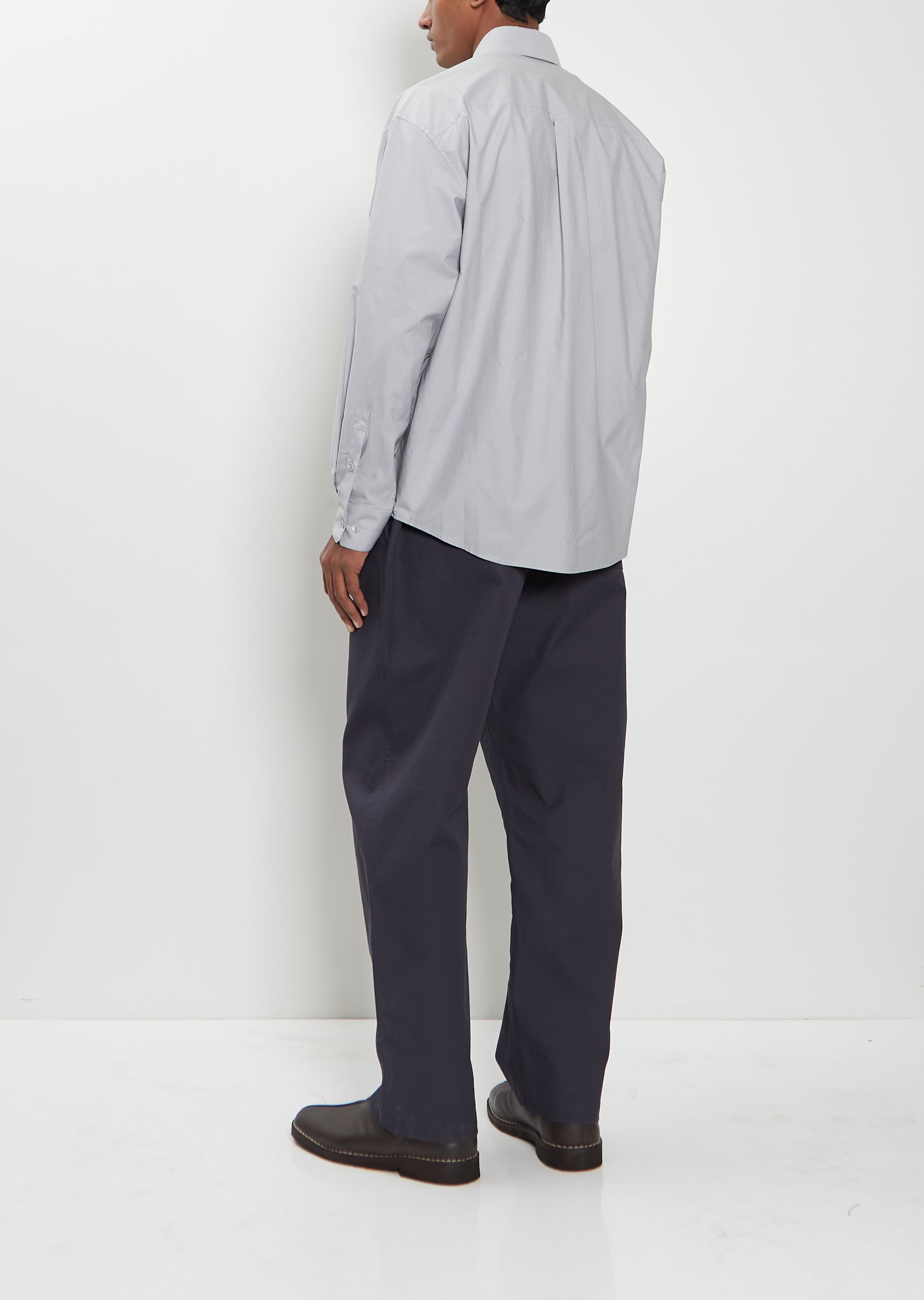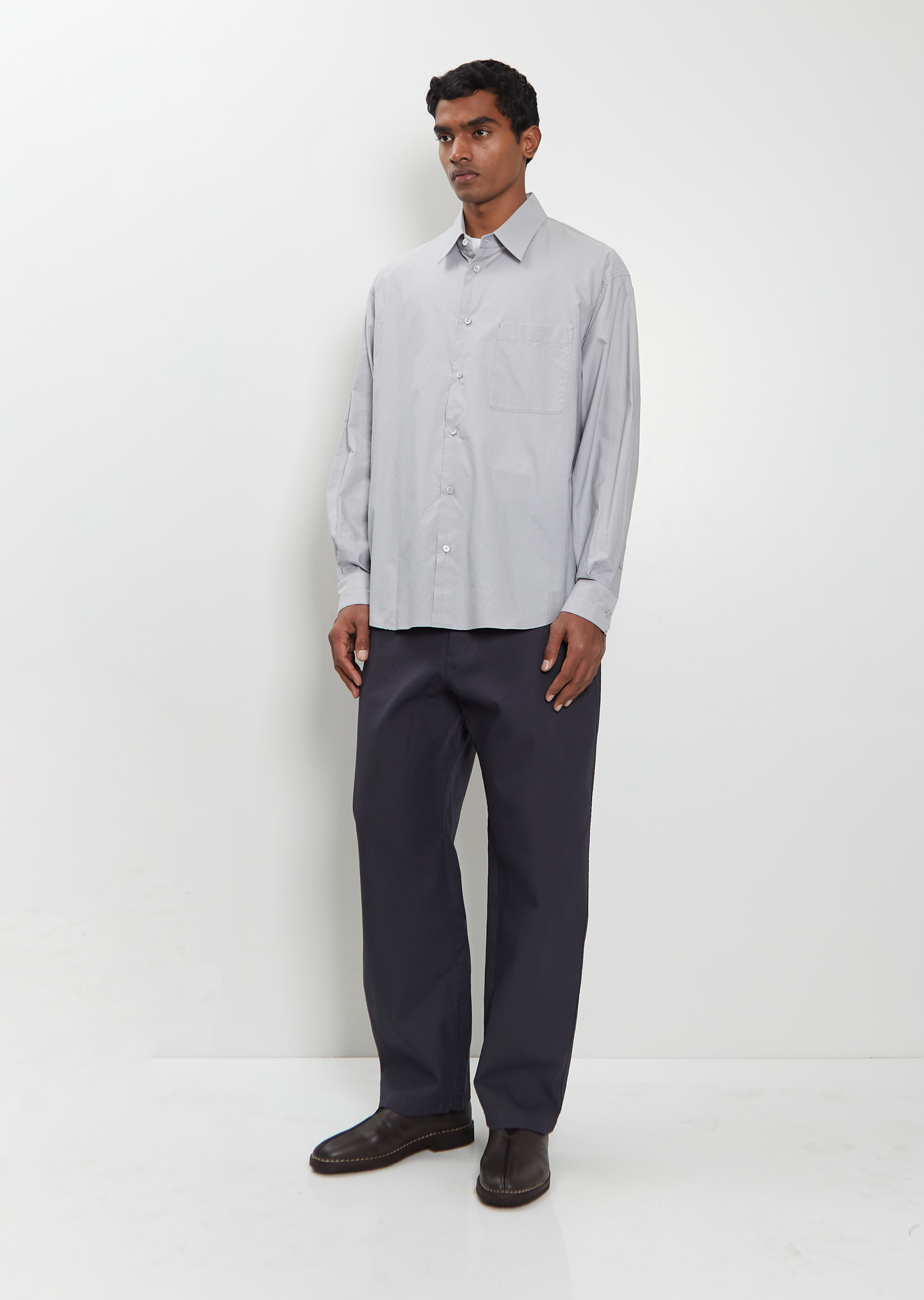 Lemaire mist blue shirt with a classic collar lacquered buttons closure in cotton and silk poplin. Features set-in sleeves, a single patch pocket at chest, pleat at buttoned cuffs, and a box pleat at back yoke. Regular fit.