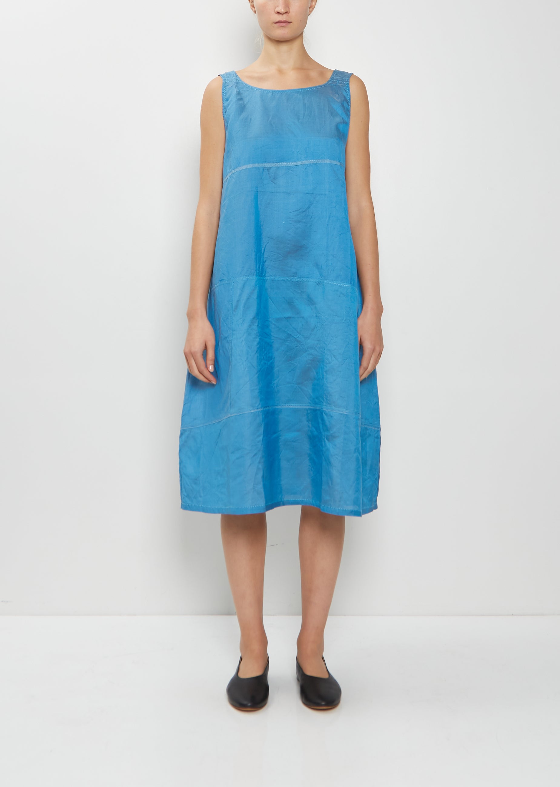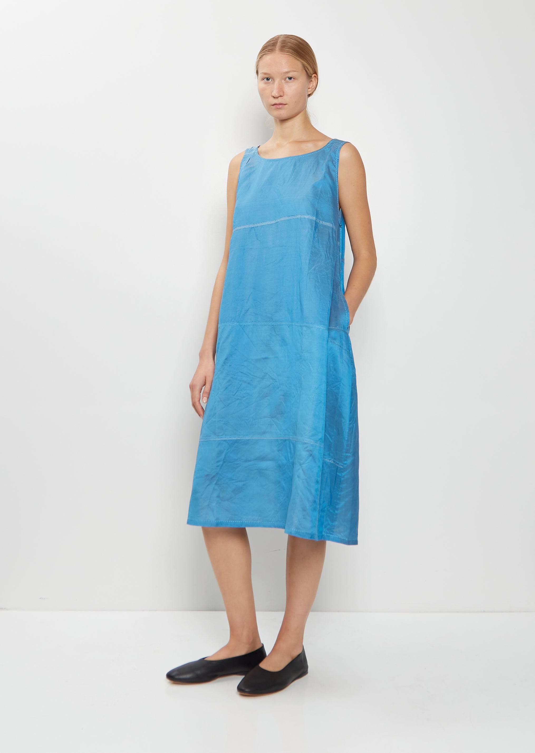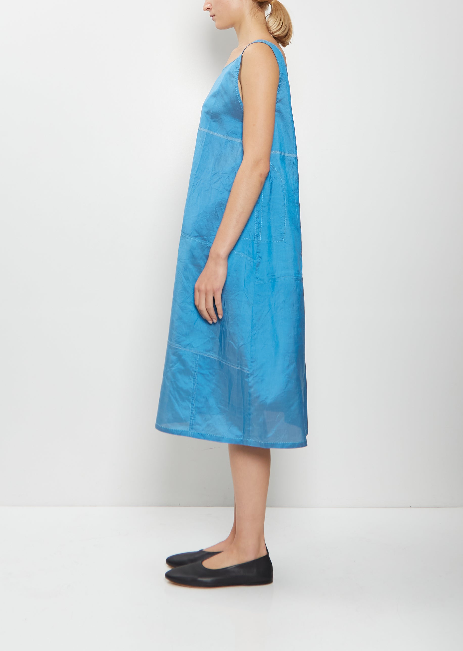 Dosa blue pullover sleeveless dress with a wide round neckline in smooth and luxurioussilk habotai. Features side seam pockets and patchwork stitching details throughout. A-line silhouette.