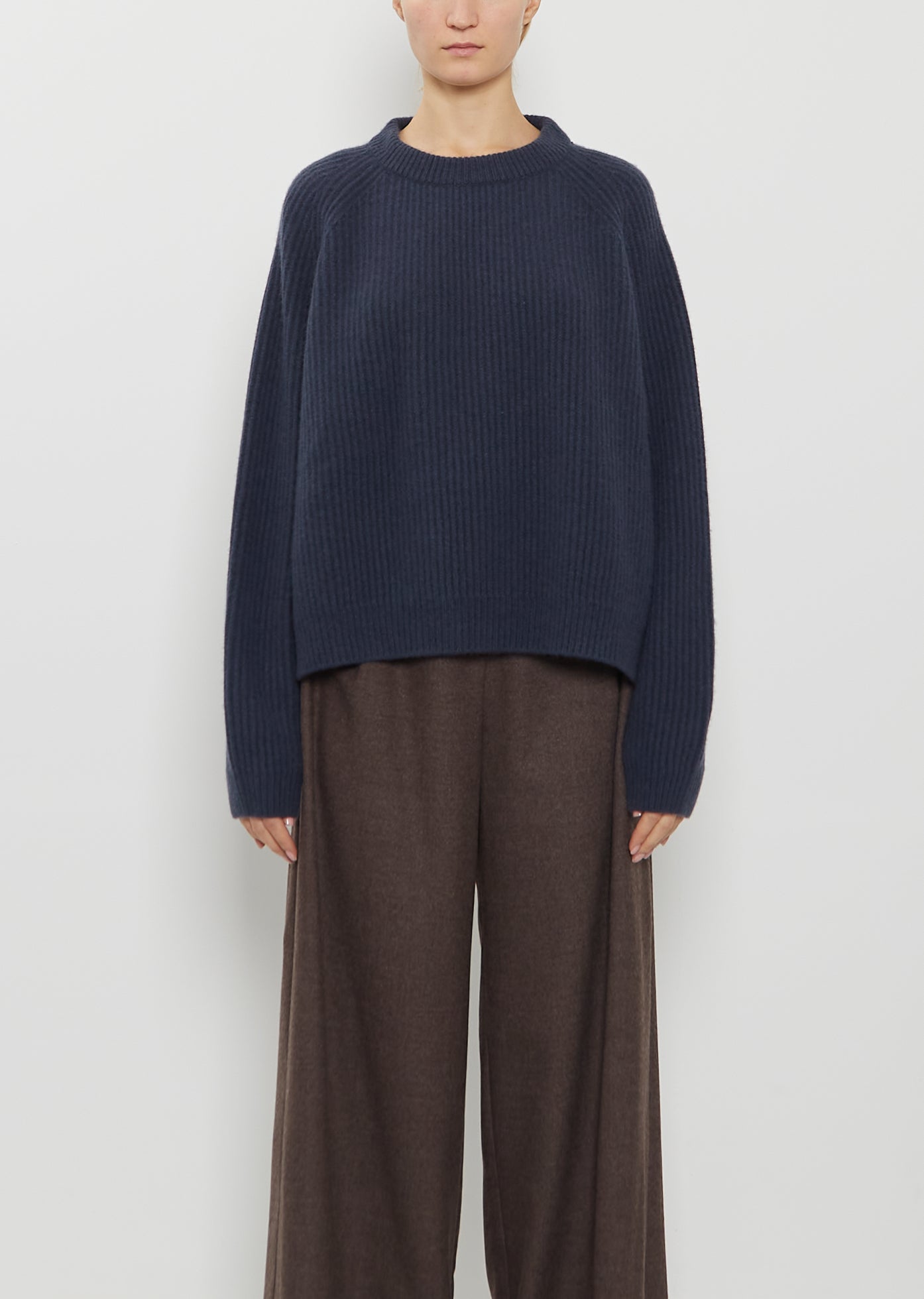 Dušan pacific blue sweater with a crew neckline and raglan sleeves in ribbed cashmere knit. Features contrasting ribbed trim finish at neckline, cuffs, and hem. Relaxed fit.