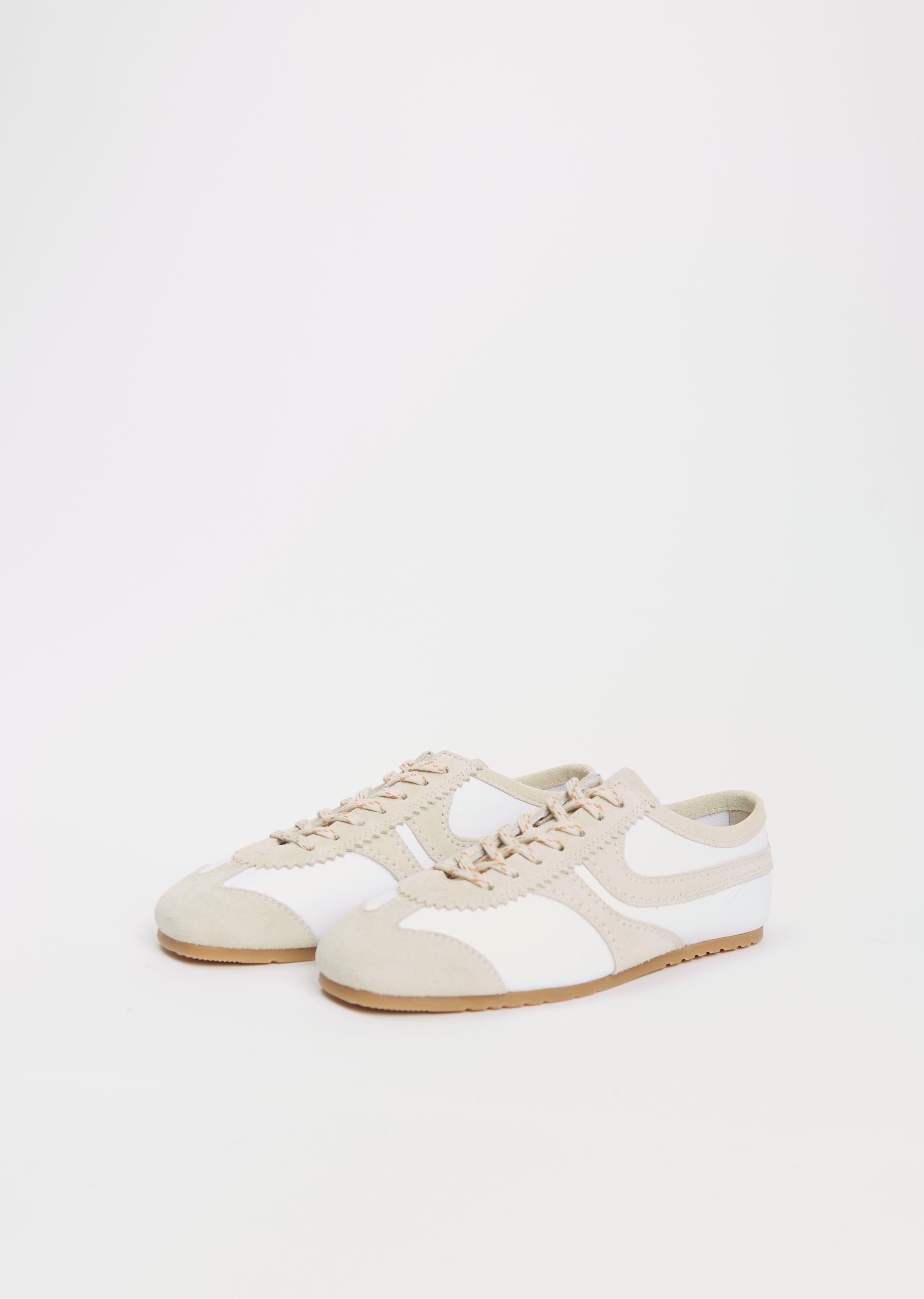 Dries Van Noten white retro runner sneaker in soft nappa leather with suede leather detailing. Features a round toe, a lace-up vamp with contrasting laces, leather lining and a rubber sole.