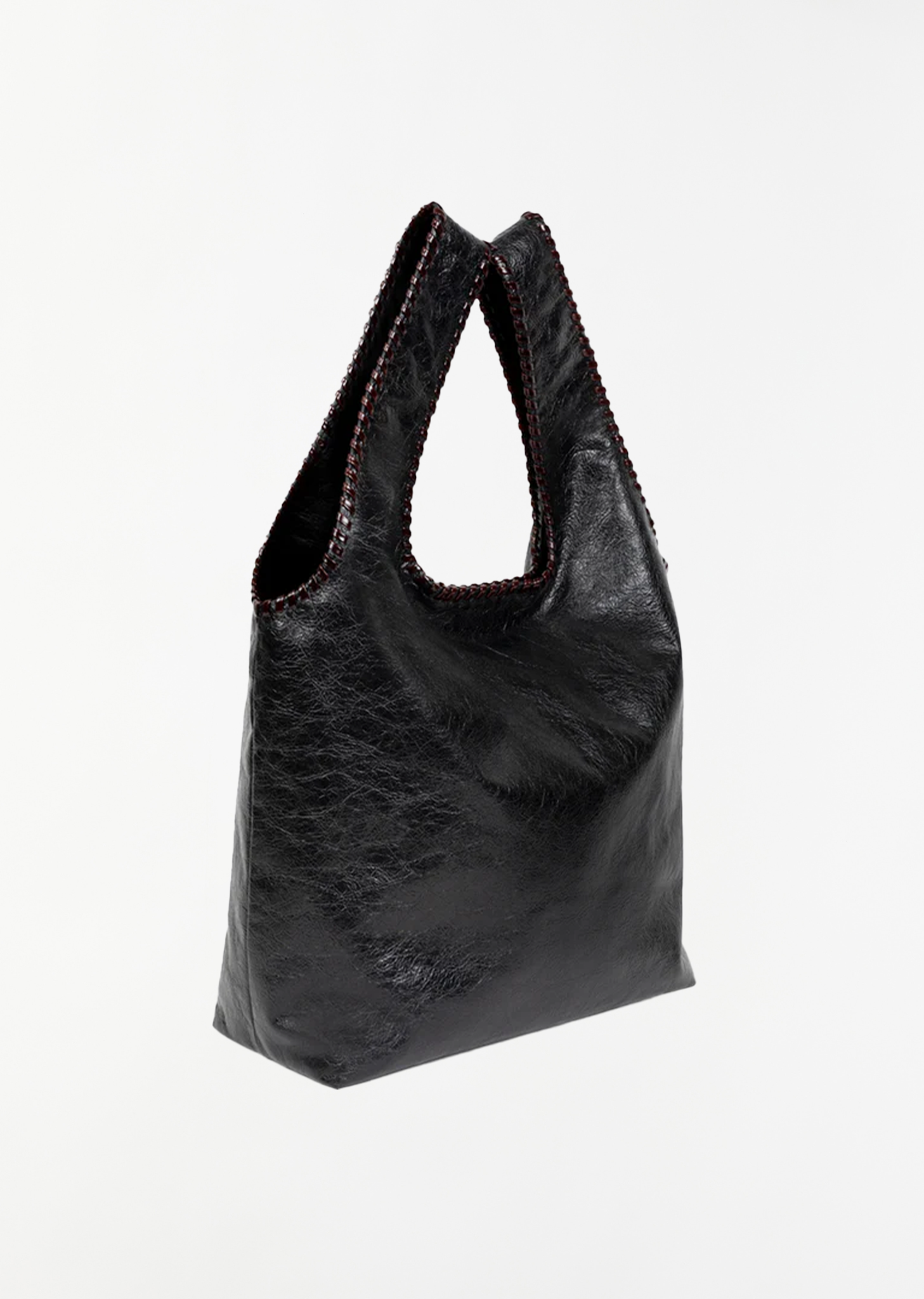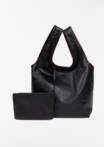 Dries Van Noten black shopper tote with top handles and a removable inner zippered pouch in leather. Features tonal top stitching and a concealed interior magnetic closure. Lined in tonal leather.