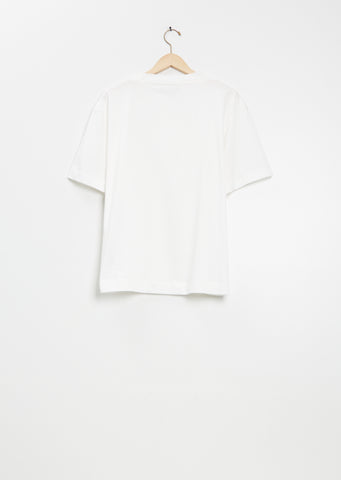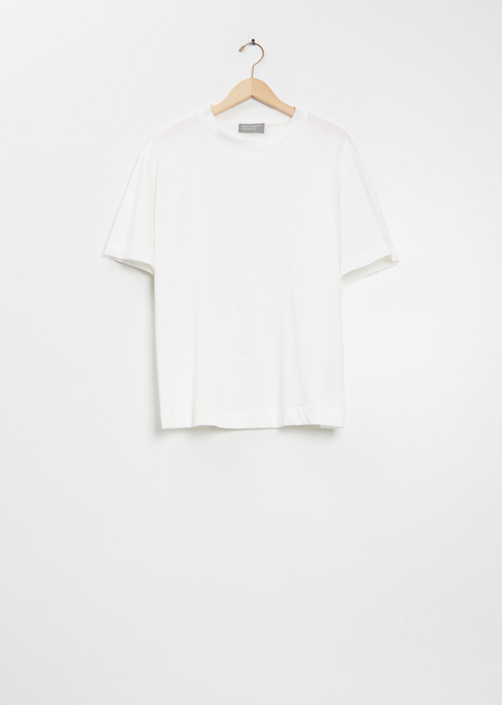 Margaret Howell off white short sleeve t-shirt with a crew neckline and dropped shoulders in fine cotton jersey. Features fine ribbed trim finish at neckline and a straight hem. Relaxed, boxy fit.
