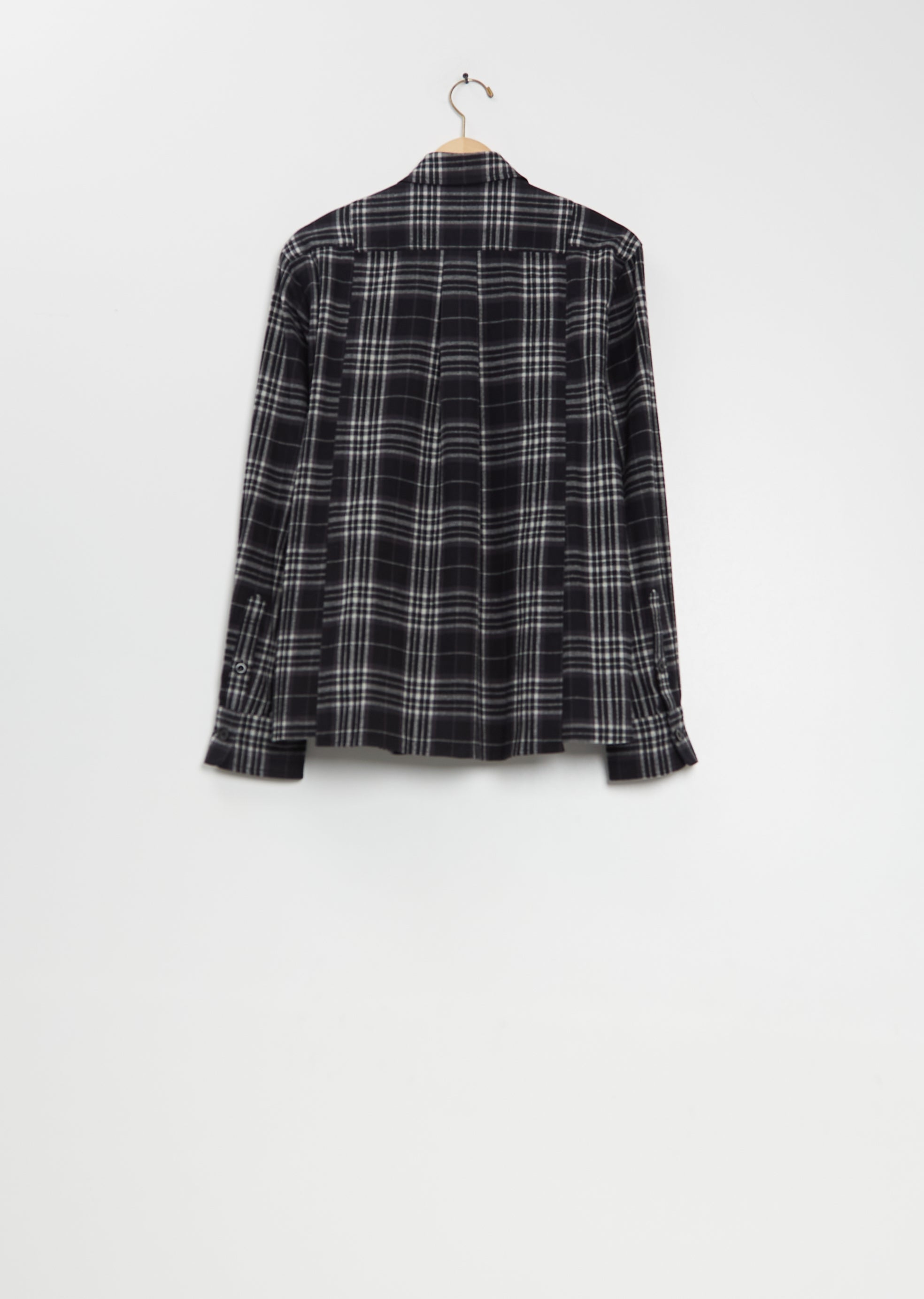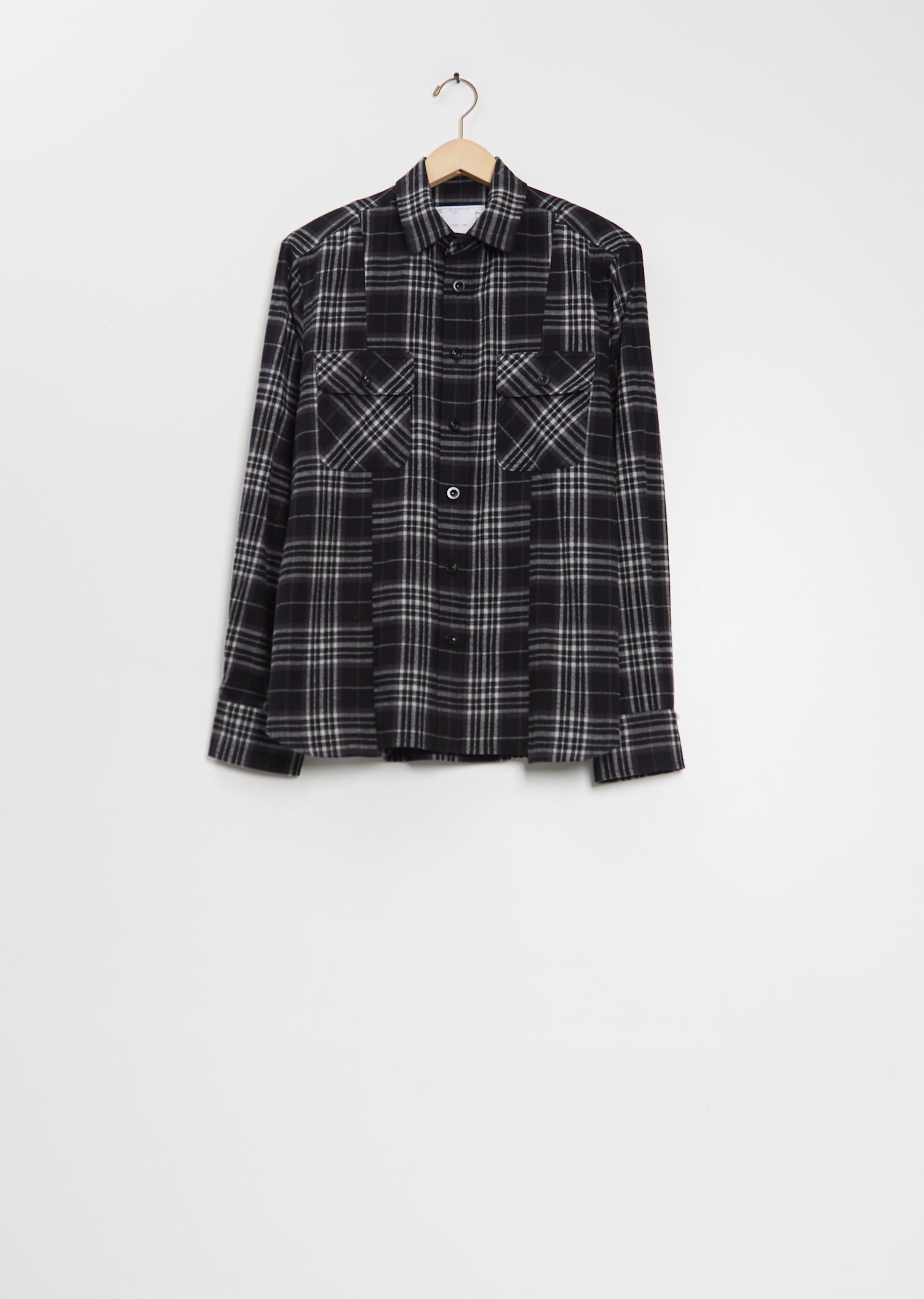 Sacai black plaid shirt with a classic collar and split construction in cotton flannel. Features buttoned flap chest pockets, buttoned cuffs, curved hem with herringbone taped gusset, box pleat at back yoke, and a tonal button front.