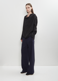 Toteme navy pull-on trousers with wide, straight legs and an elasticated waist in lightweight fluid canvas. Features a faux placket, pintuck details at legs, large front pockets, and patch pockets at back.
