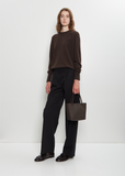 The Row deep brown small tote bag in grained calfskin leather with dual top handles, removable and adjustable shoulder strap, and interior toggle closure. Fully lined in tonal suede.