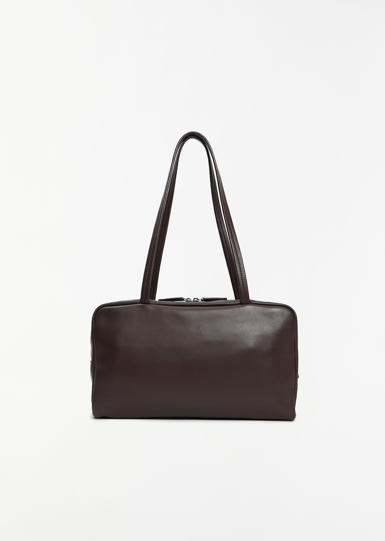 The Row burgundy bowling bag with elongated flat handles and dual zipper closure in soft and fine nappa leather. Features a single interior zipper closure and two slip pockets.