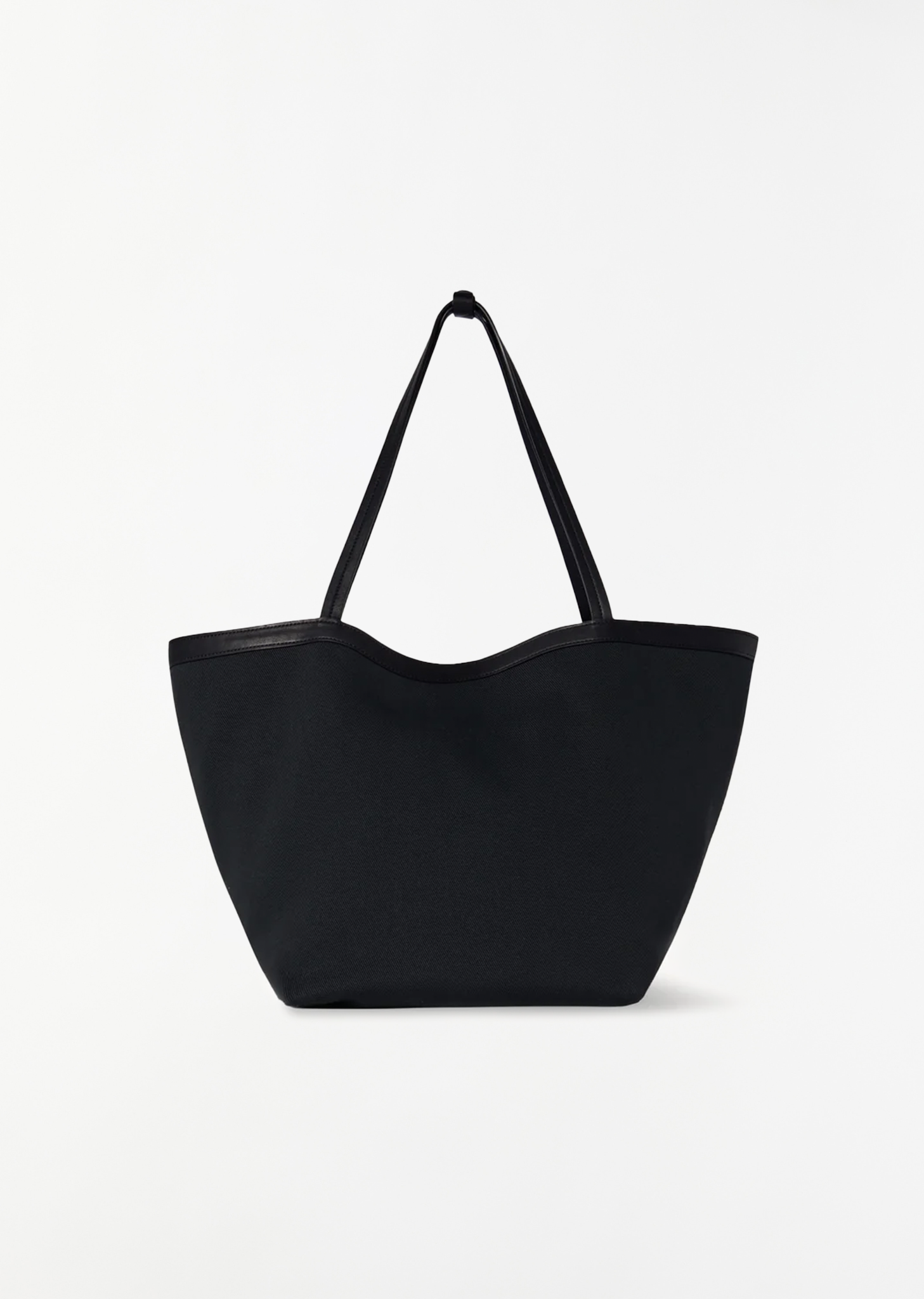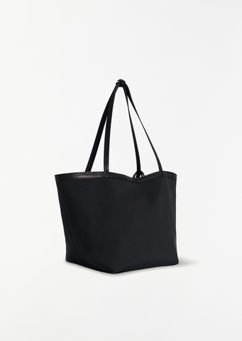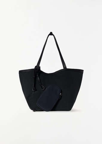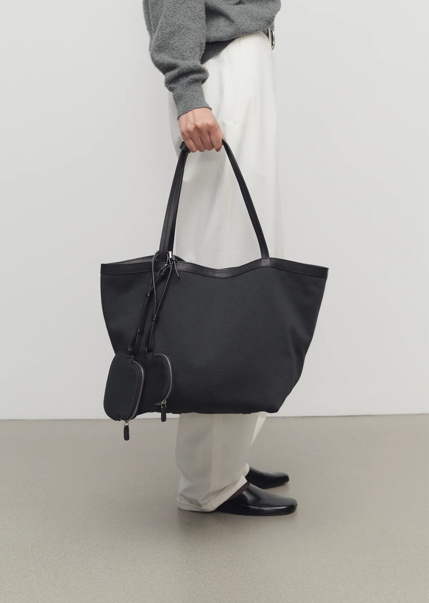 The Row black and blue classic tote bag with leather flat handles and two removable wristlets in textured cotton twill. Features a press button band closure for top handles and leather bag studs at bottom. Lined in self.
