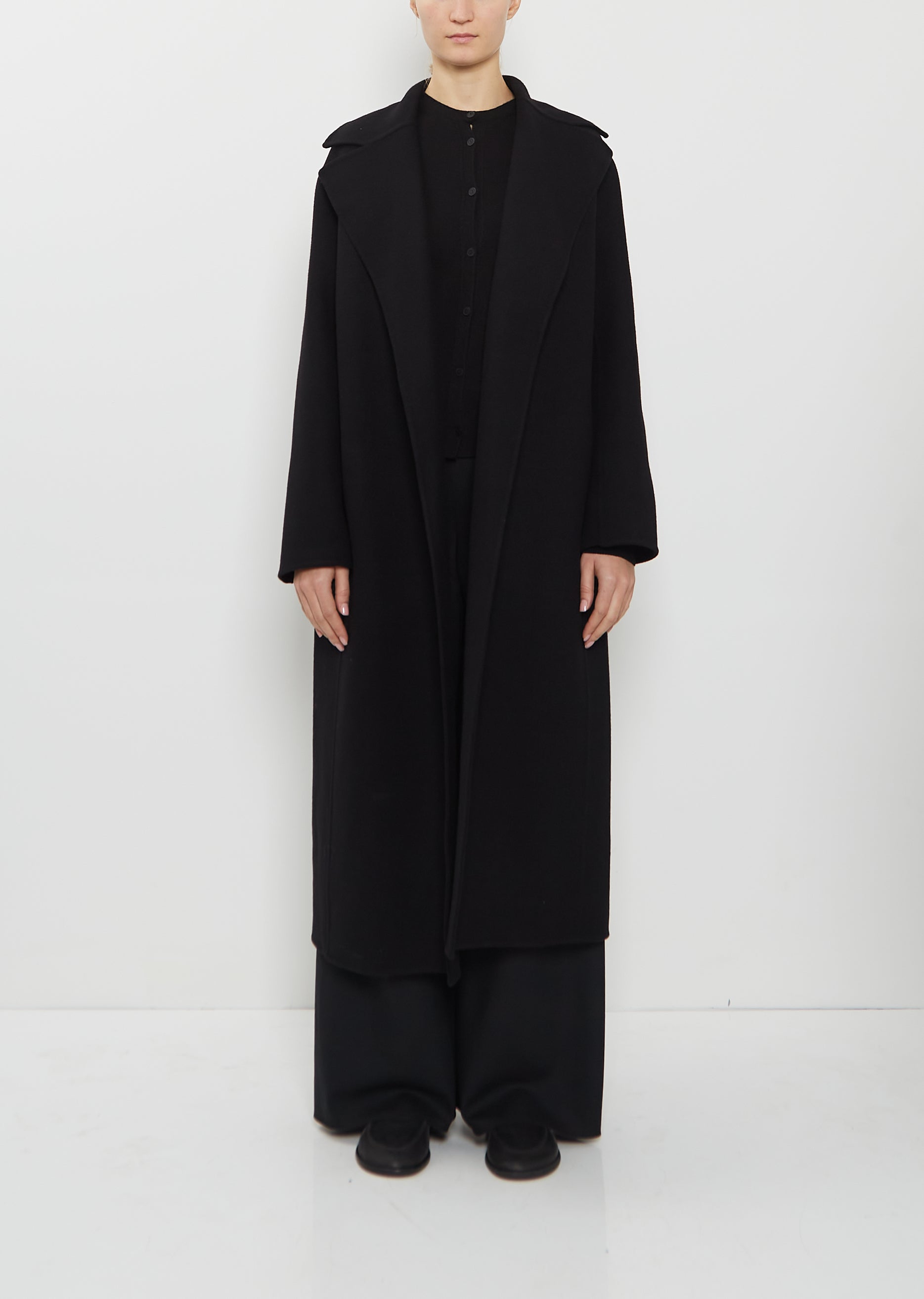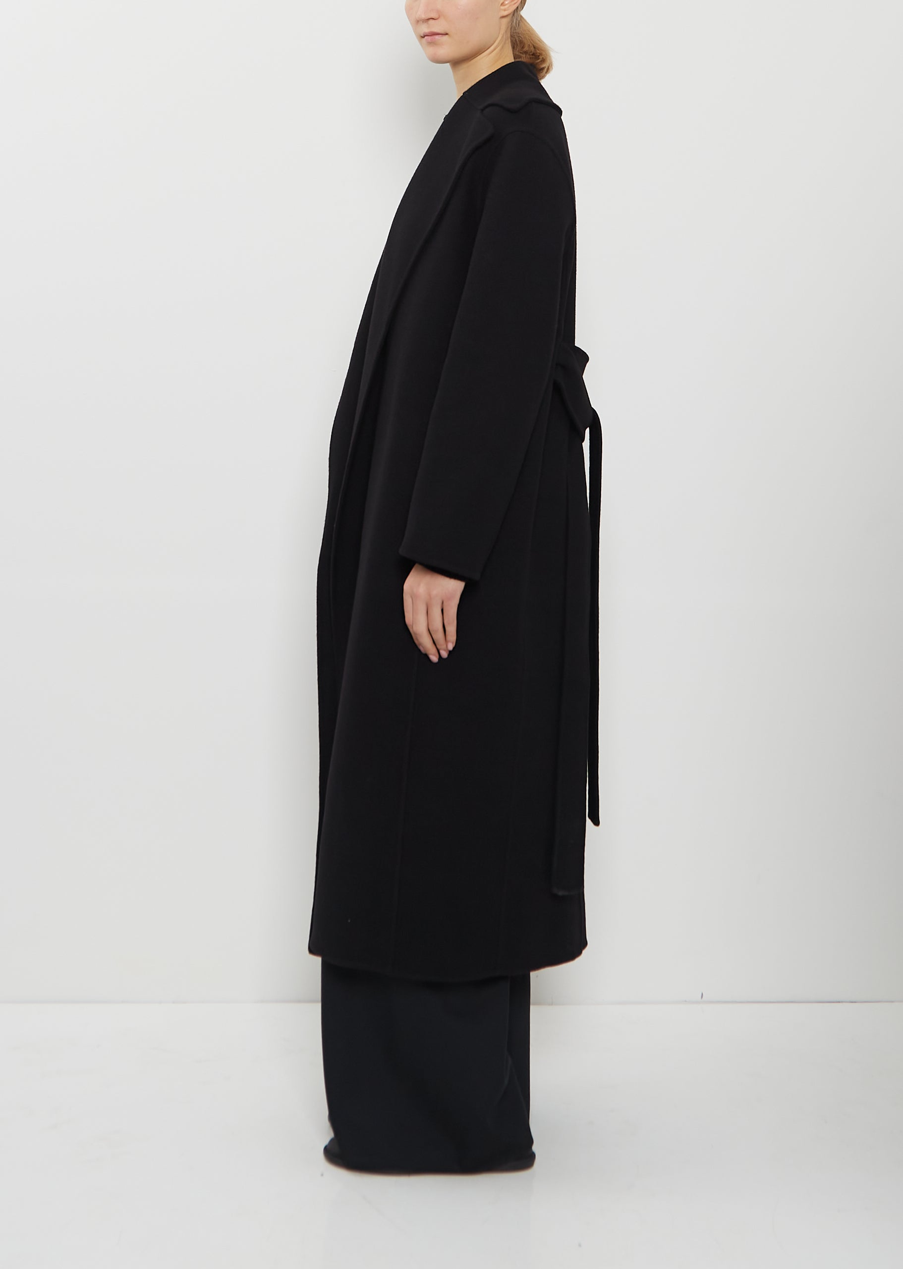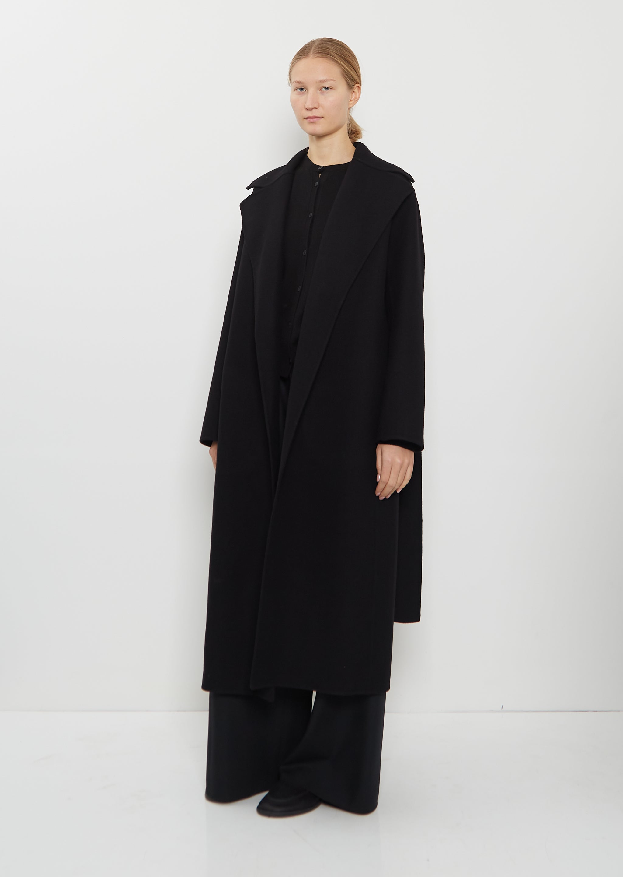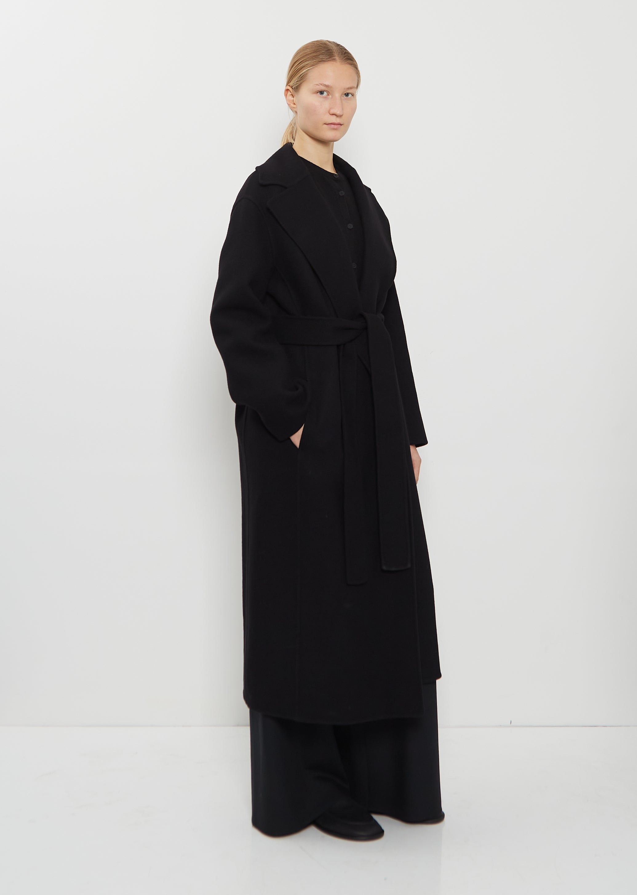 The Row camel coat with oversized notched lapels and removable self belt handcrafted in double-faced brushed wool. Features dropped shoulders, side seam pockets, and slit at back hem. Pockets lined in tonal silk fabric.