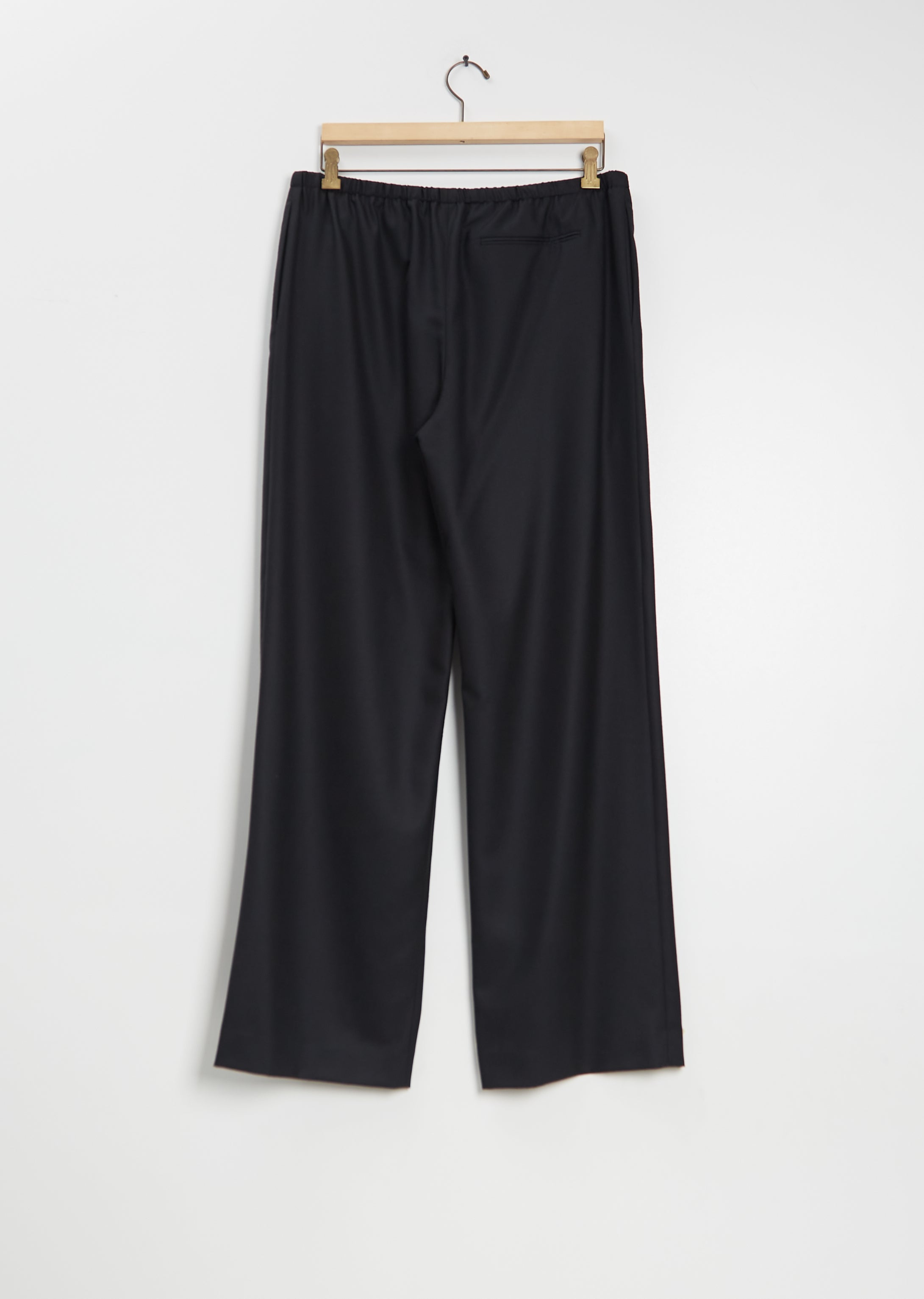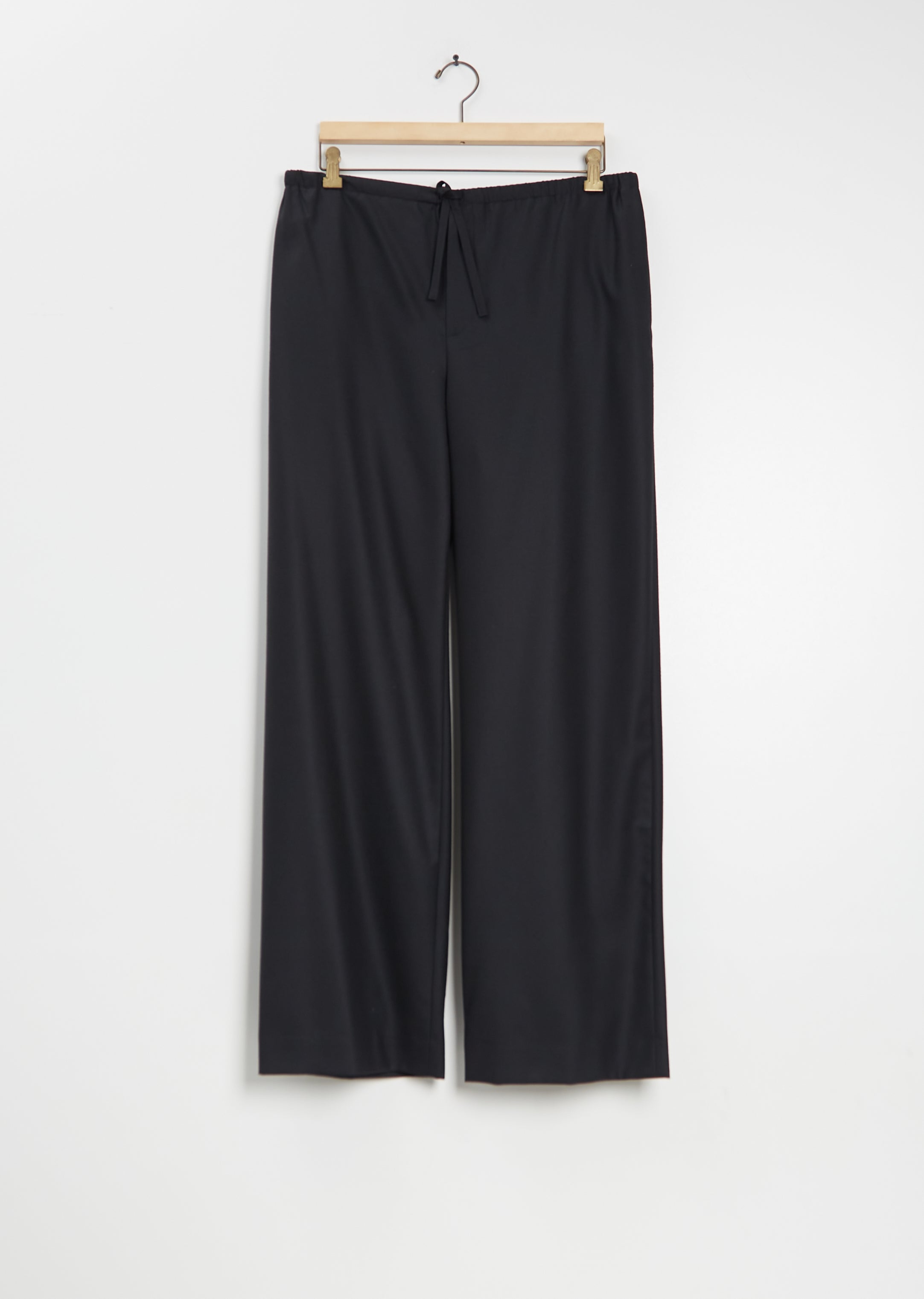 The Row black pull-on pant with wide, straight legs in virgin wool flannel. Features an elasticated drawstring waist and side seam pockets. Relaxed fit.