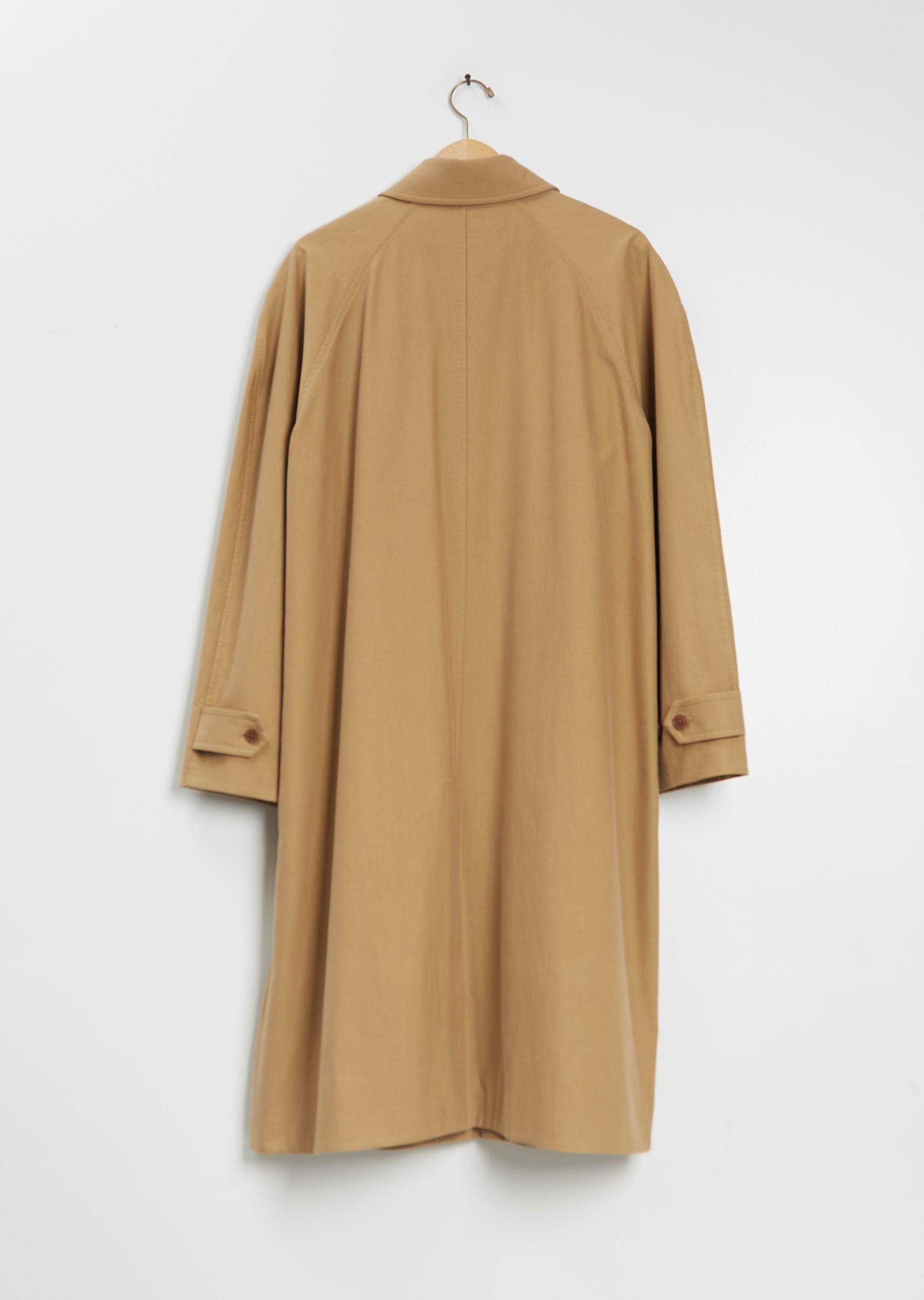 The Row dark beige single-breasted coat with a classic collar and concealed horn-hued buttons closure in cotton and cashmere blend twill. Features a single visible button at neck, raglan sleeves, angled welt pockets, buttoned tabs at cuffs and a buttoned vent at back hem. Comes lined in tonal cotton.