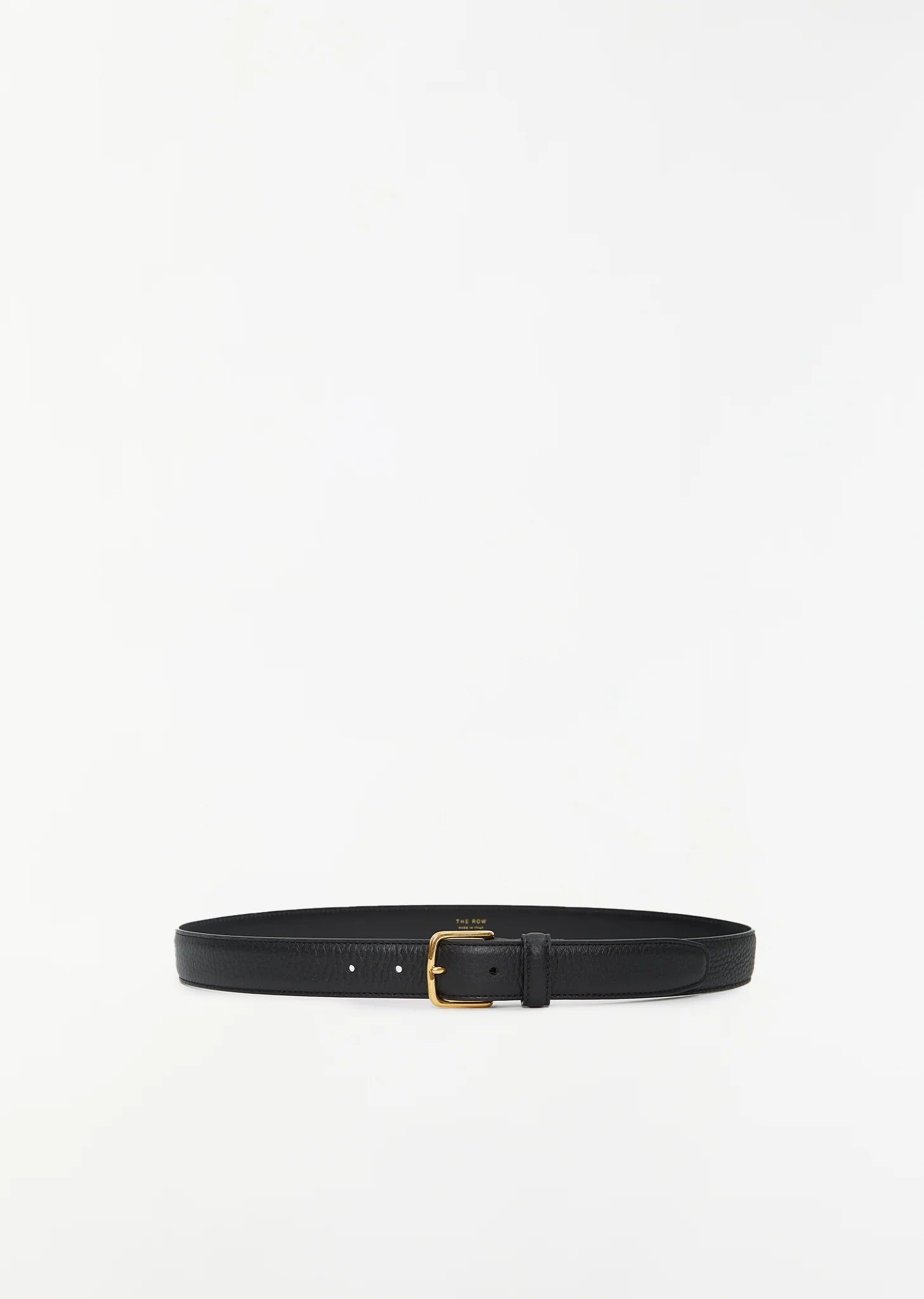The Row classic black belt with a square gold-toned metal buckle and fixed loop in vintage grained calfskin leather.