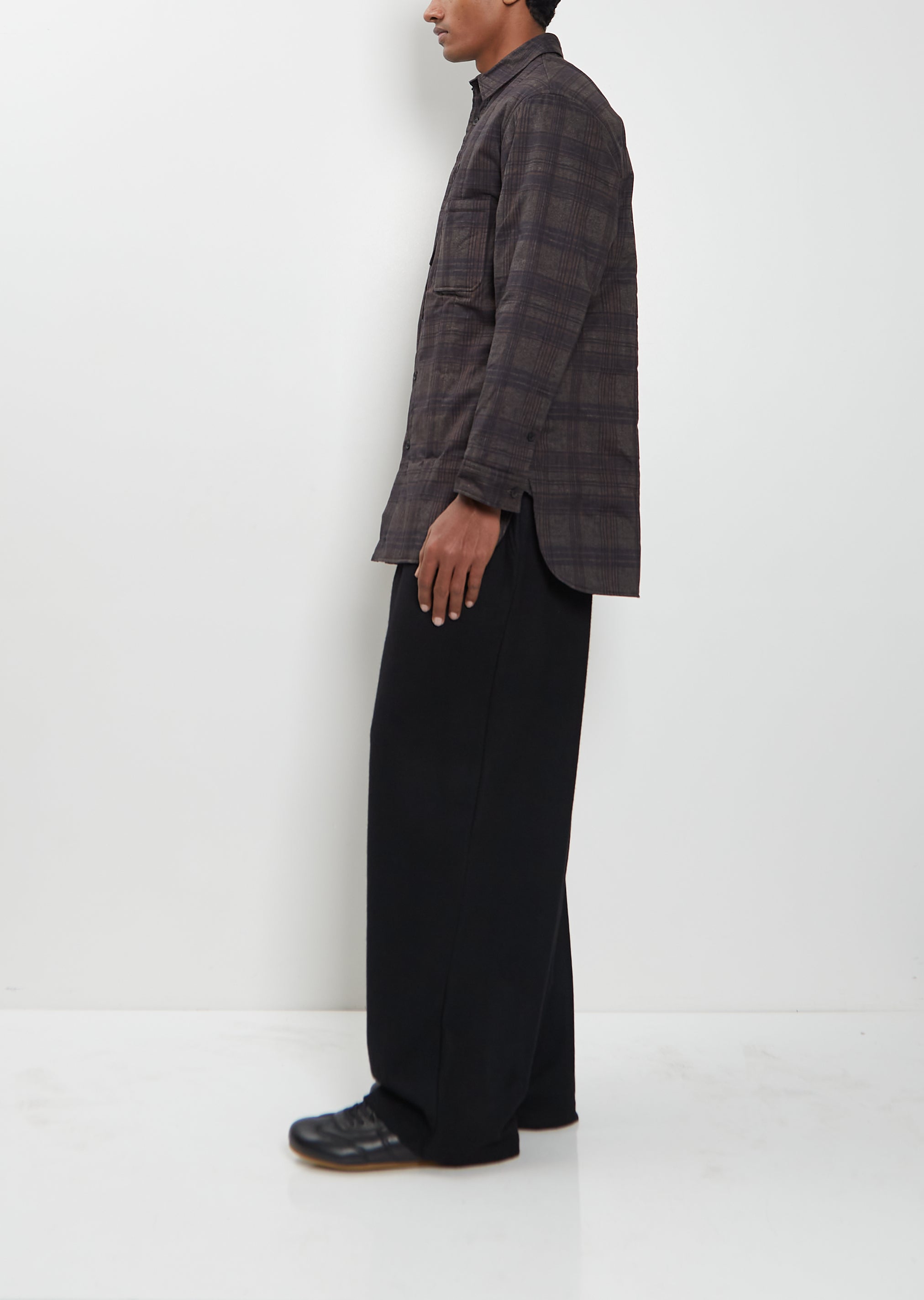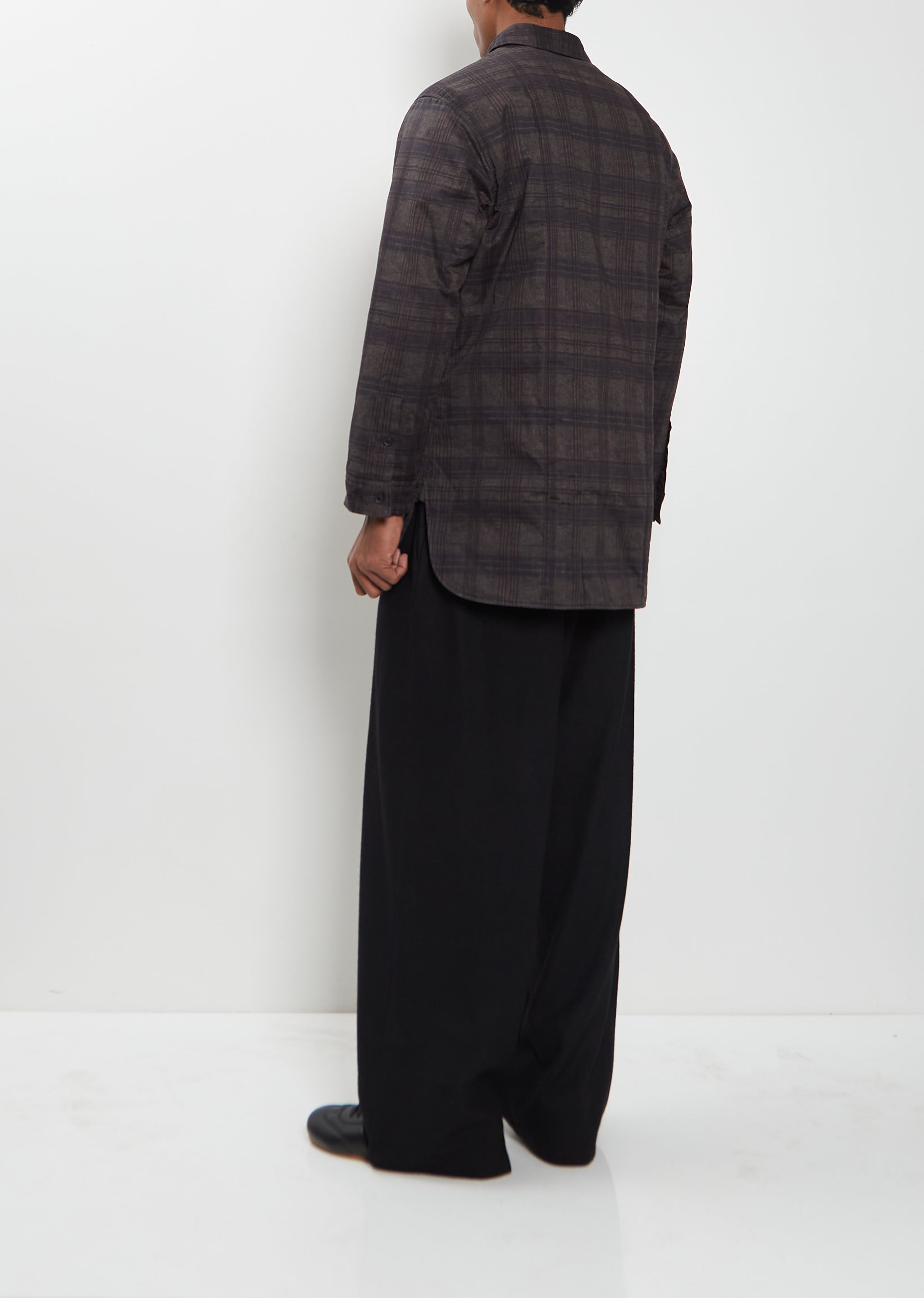Yohji Yamamoto black and brown checks padded shirt with a spread collar and set-in shouldrs in washed yarn-dyed cotton. Features a layered placket detail, single patch pocket at chest, buttoned cuffs, side slits, curved hem and tonal buttons closure.