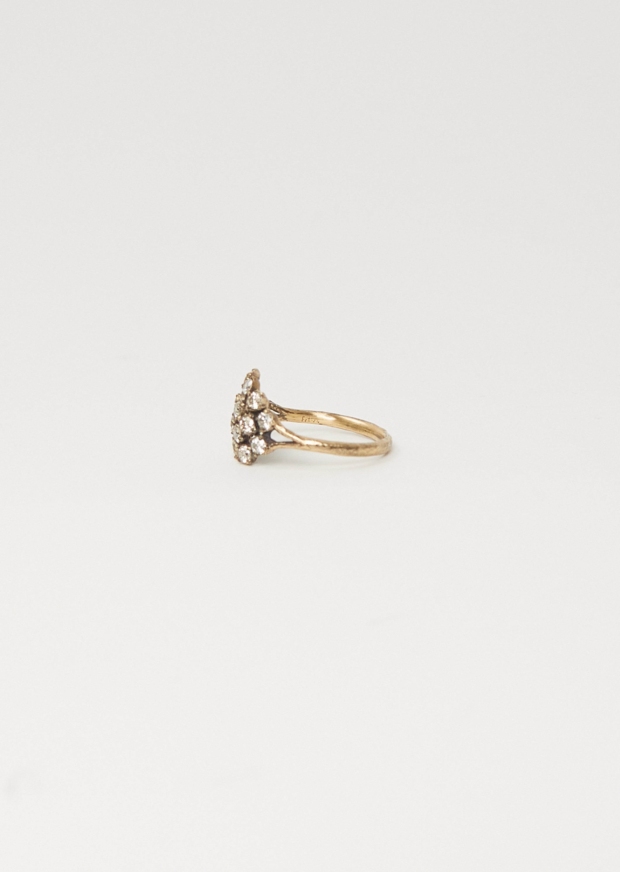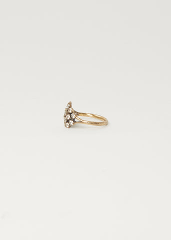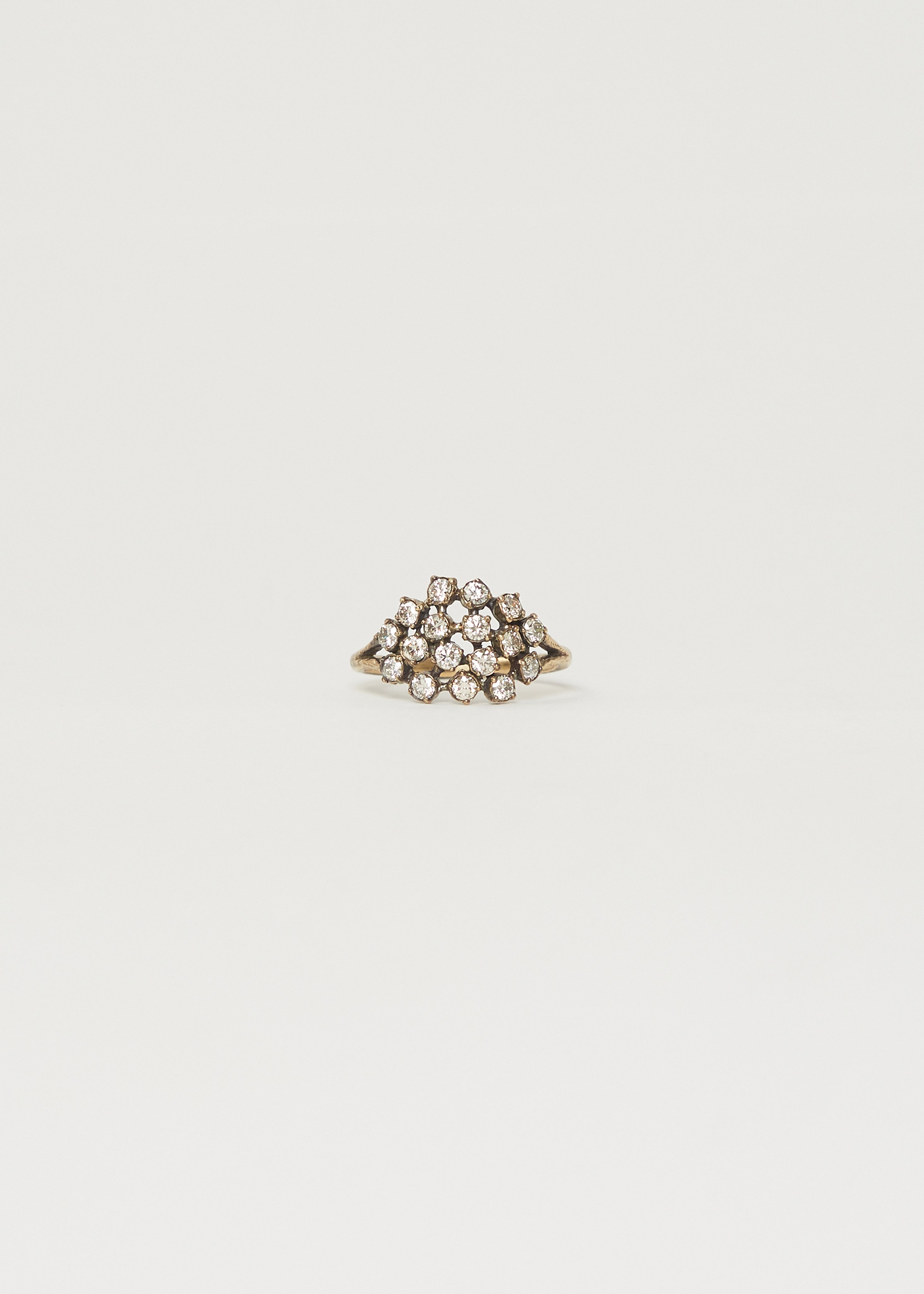 Noguchi Bijoux cluster ring with 17 brown diamonds in a lattice structure on a 14k brushed yellow gold band.