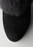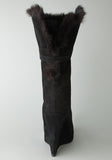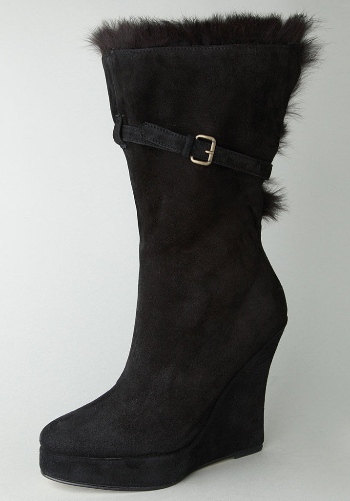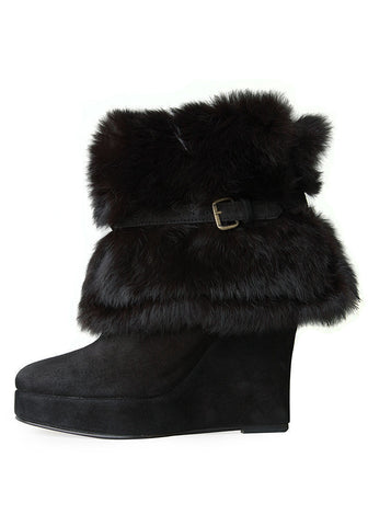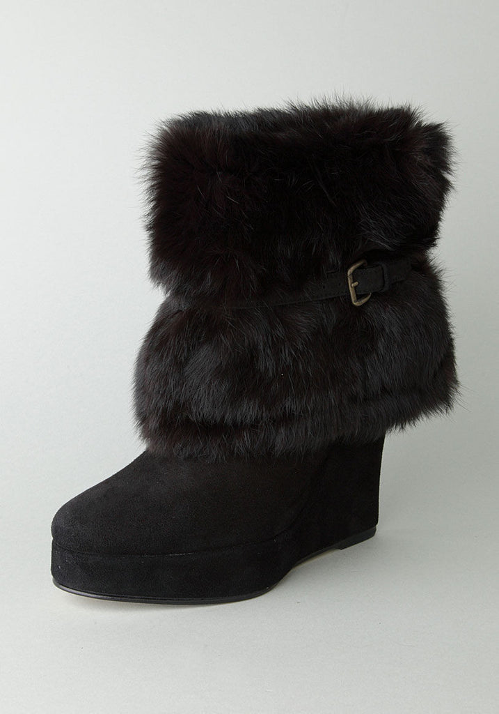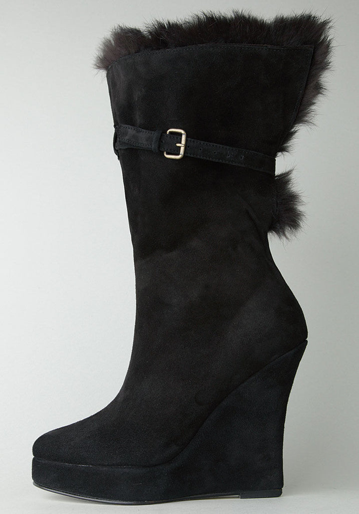 Tapered toe / Fur inner folds over to make the boot ankle height / Thin suede belt feeds through loop at center front of cuff & buckles to side / Belt has 7 holes for adjustable widths / Boot can also be worn with cuff straight up / Belt feeds through loop at front of suede side / 6" slit down center back from top edge / 4.75" self-covered wedge / 1" self-covered platform / Leather insole & sole / Treaded rubber piece at heel / Color: Black / 100% Suede Leather & Fur.