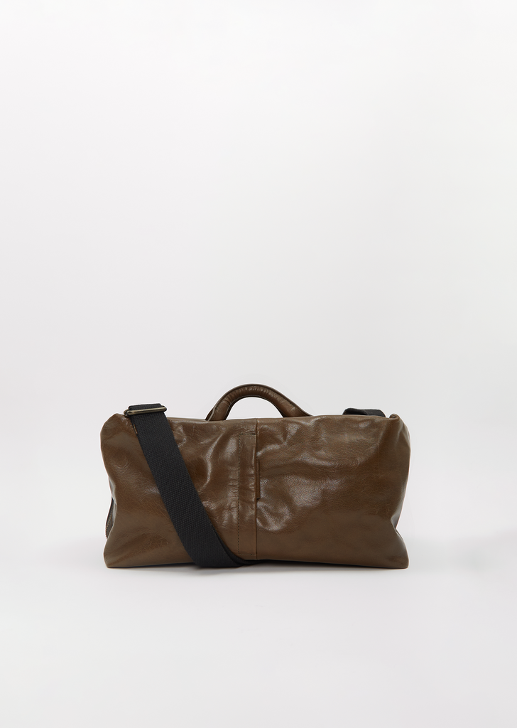 Bea Mombaers olive leather bag in the medium size with an adjustable black cotton shoulder strap and top handles in buffalo leather. Features two exterior vertical hidden zippered pockets, a single interior zippered pocket, two interior slip pockets, a detachable clasp key ring, and a top zipper closure. Lined in cotton canvas.