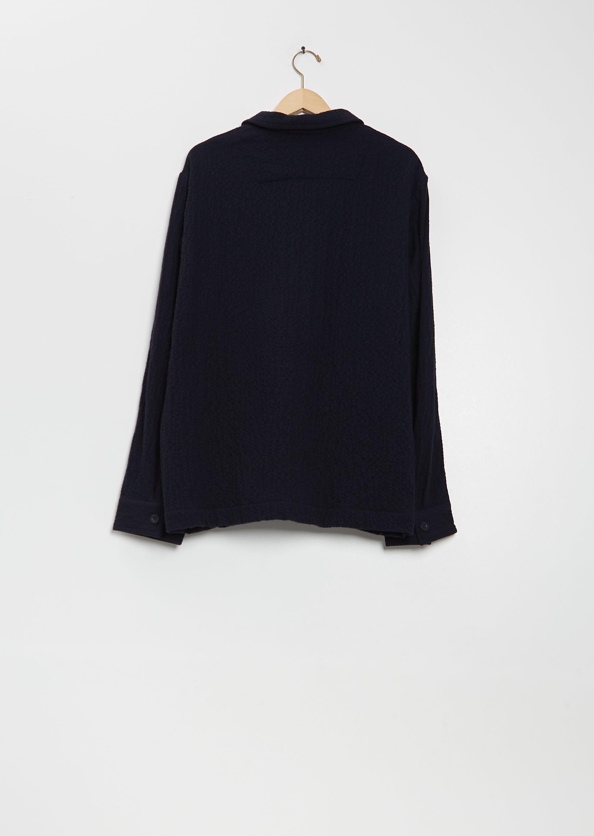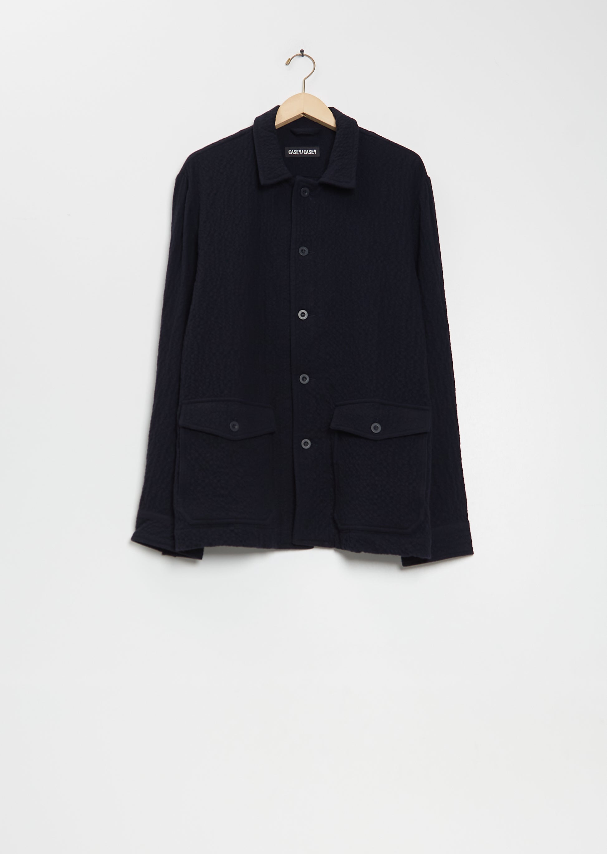 Casey Casey navy shirt with a spread collar and tonal button front in a soft cashmere blend with a seersucker effect. Features dropped shoulders, buttoned flap patch pockets with side entry, and buttoned cuffs.
