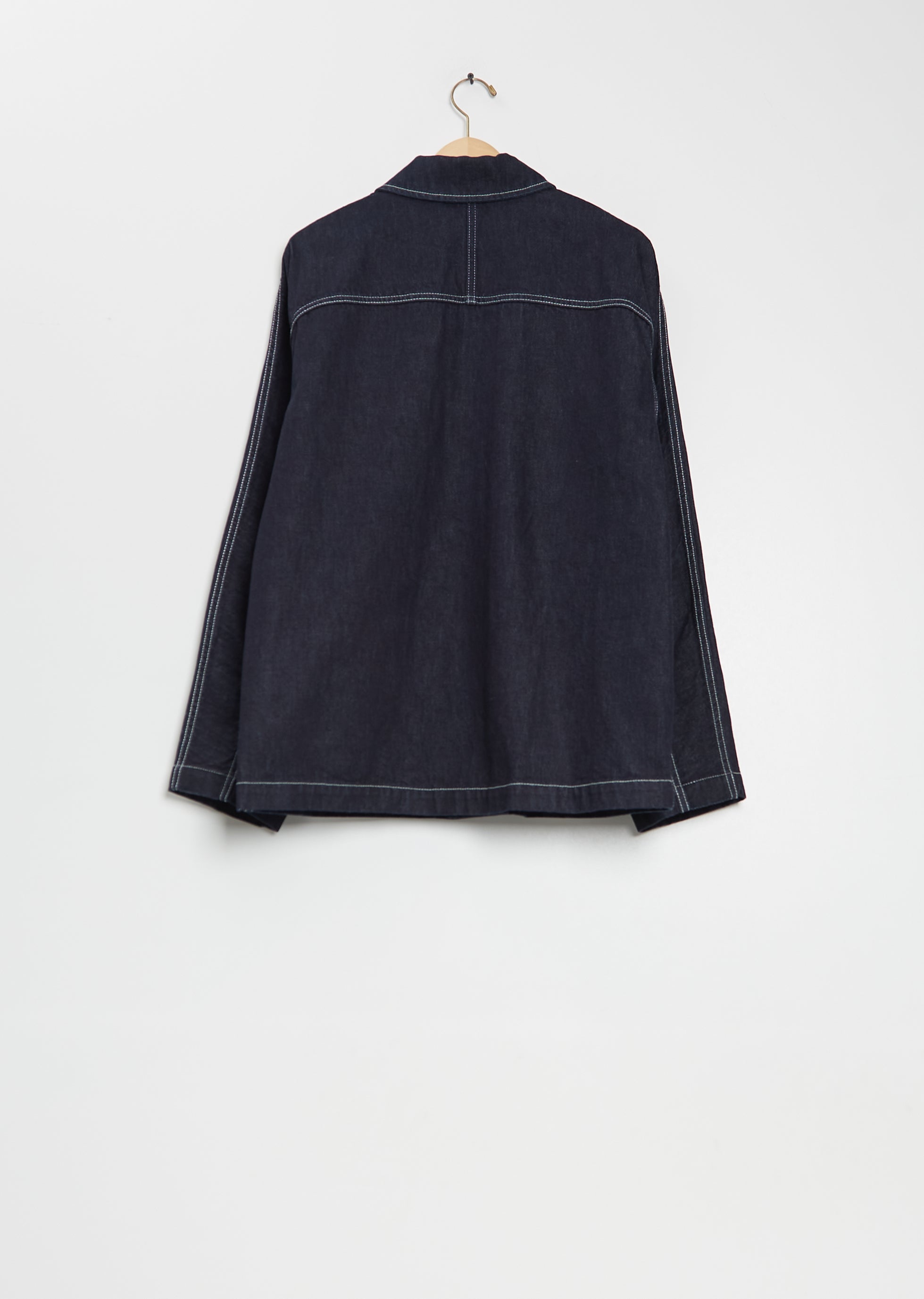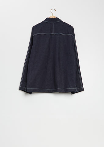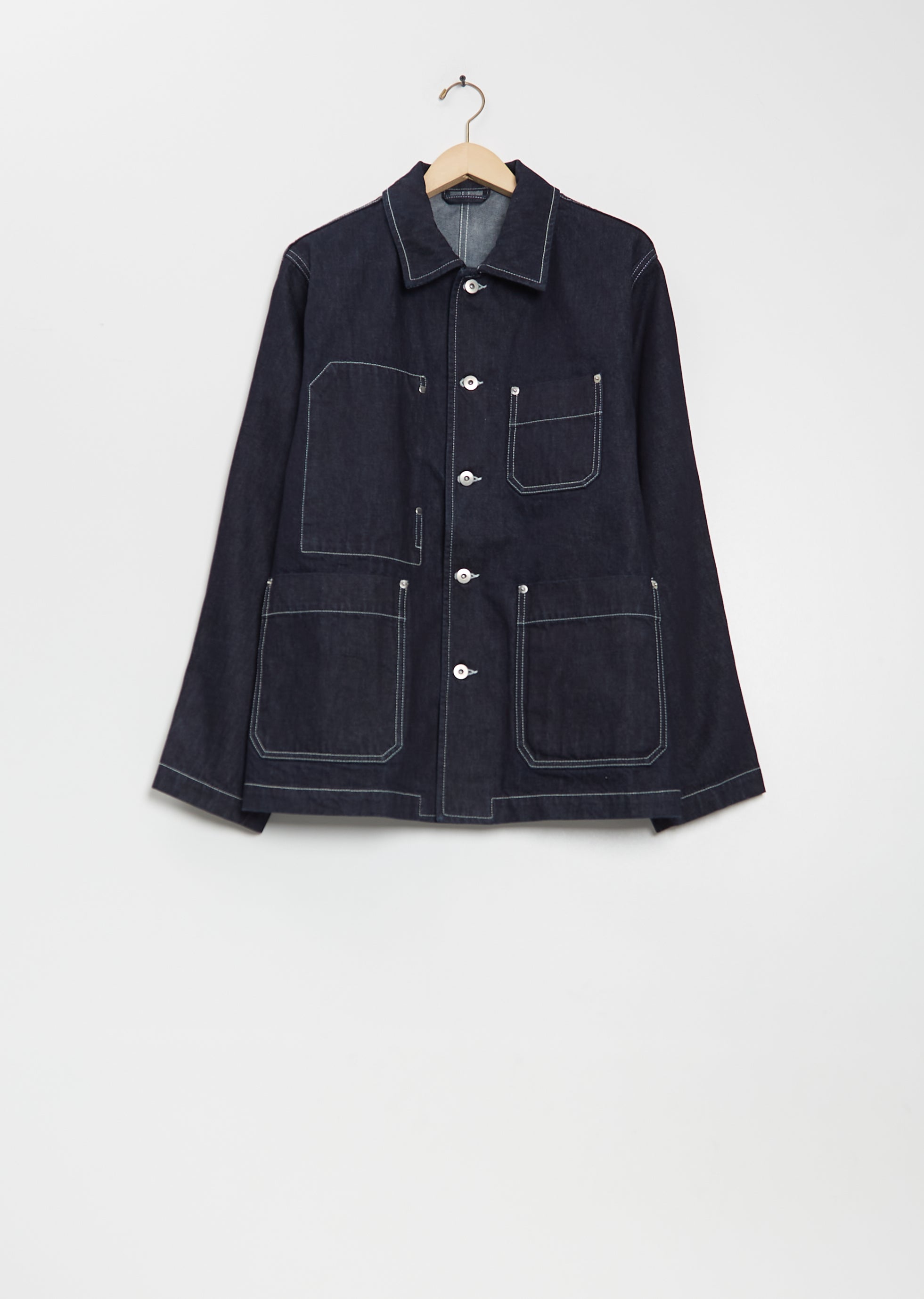 Casey Casey indigo structured jacket with a spread collar and silver rivet button front in cotton denim. Features dropped shoulders, a chest patch pocket, front patch pockets, an interior vertical patch pocket, and an interior regular patch pocket. Comes unlined.