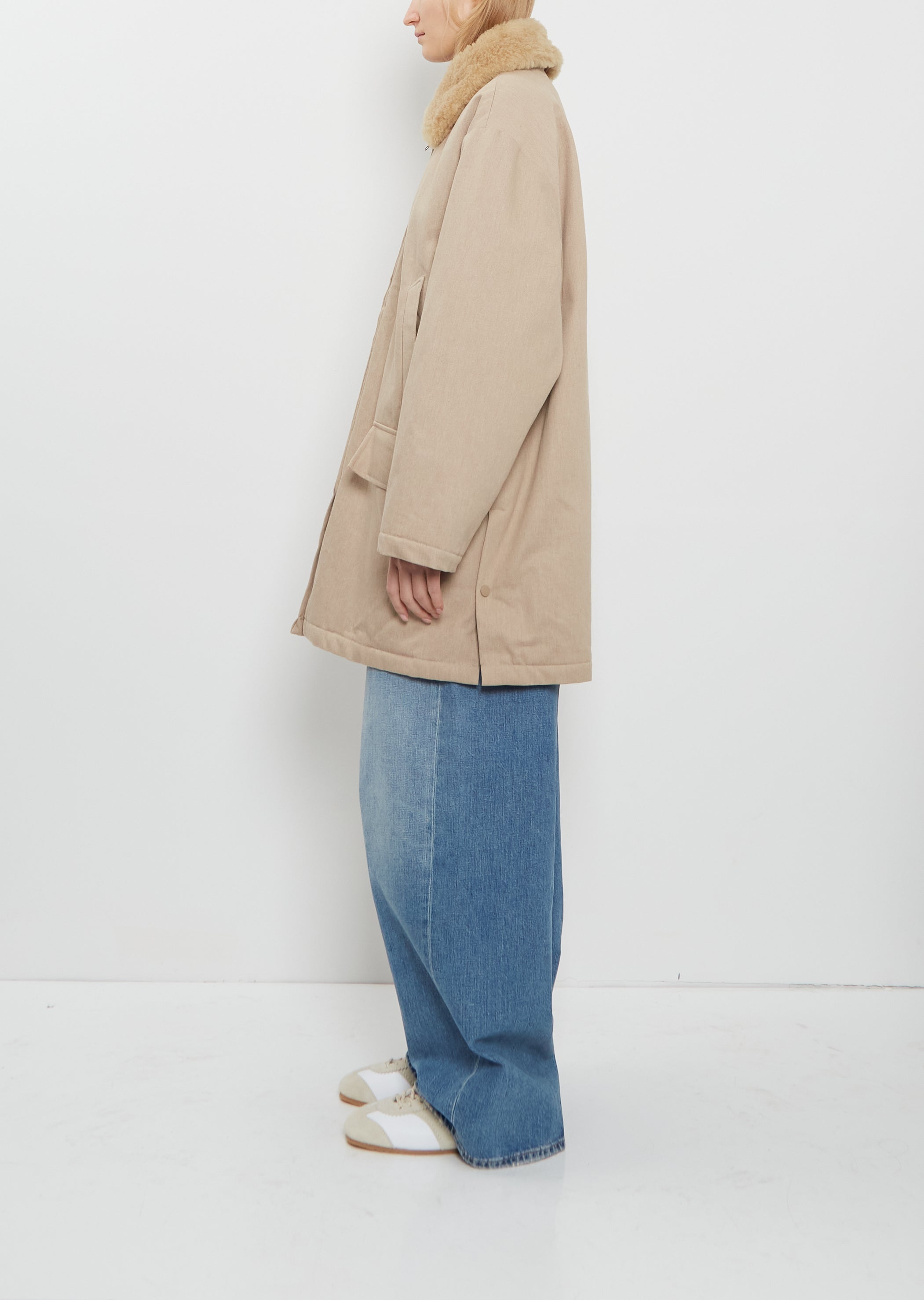 6397 sand beige parka with a removable wool fur collar and interior drawcord at waist for cinching in a Japanese cotton twill. Features dropped shoulders, flap pockets at front, welted side pockets, slits on side seams with snap button, and silver-toned zipper closure at front. Fully lined in satin. Relaxed, oversized fit.