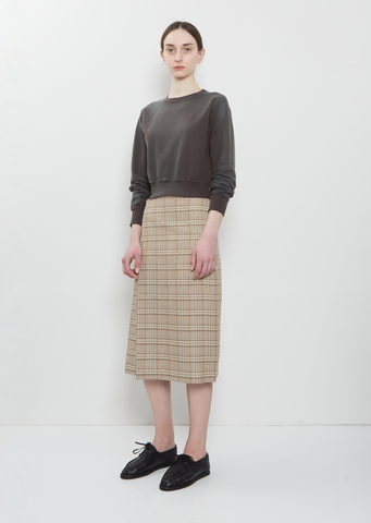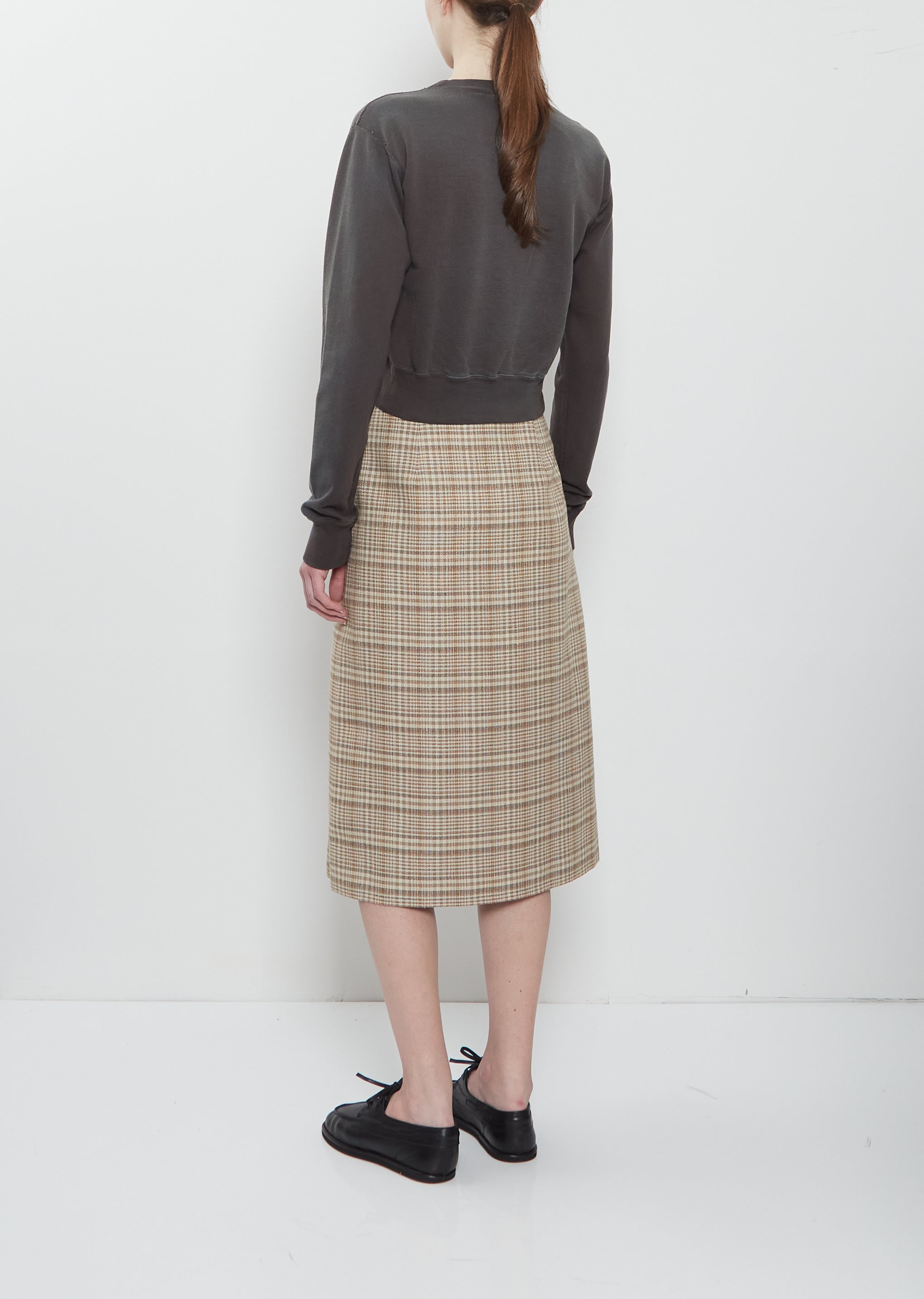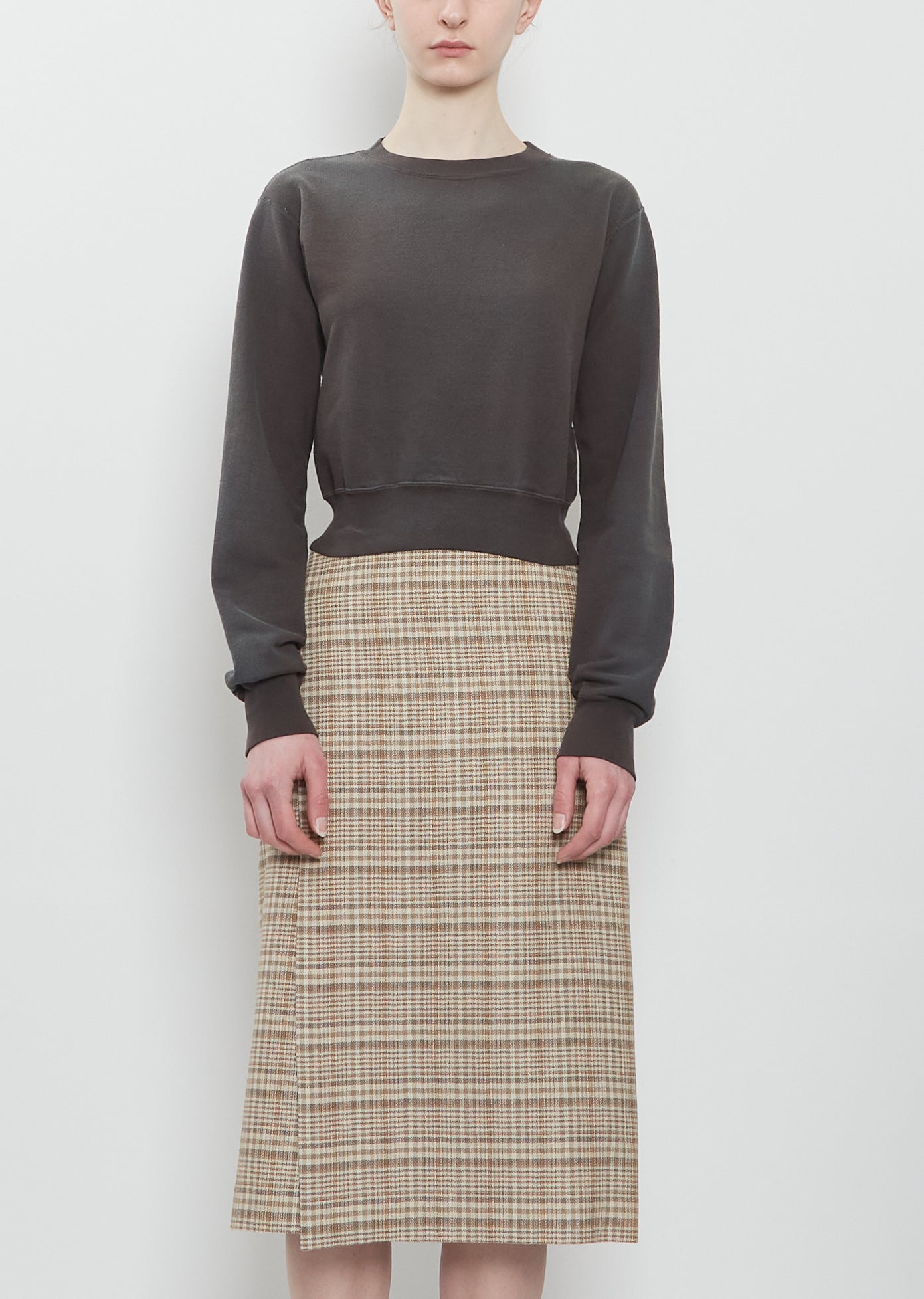 Auralee washed black cropped pullover sweatshirt with a crew neckline in lightweight and soft dyed Pima cotton terry. Features slightly dropped shoulders and ribbed trim finish at neckline, cuffs, and hem. After sewing, the fabric undergoes garment dyeing to create a unique deep, worn-in color. Regular fit.