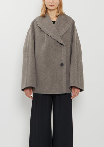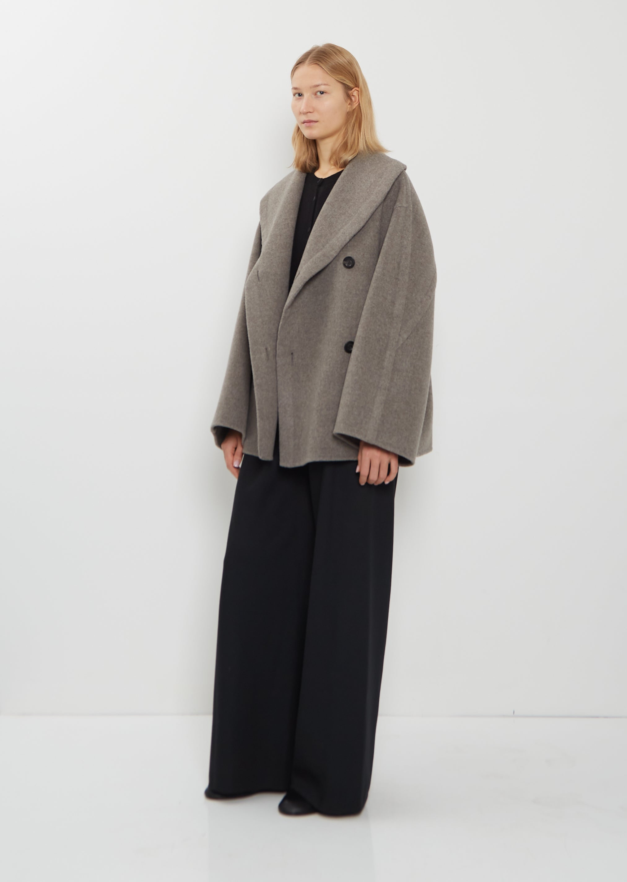 The Row grey double-breasted paneled short coat with wide shawl lapels and horn buttons closure in soft wool. Features concealed buttons at right side of placket and angled pockets. Comes unlined. Pockets lined with soft pure silk.