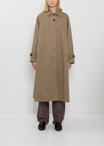 The Row taupe single-breasted coat with a spread collar and horn buttons throughout in a crisp cotton twill. Features adjustable buttoned tab at cuffs, angled welt pockets, a center back box pleat and concealed front placket with two visible buttons. Lined in smooth pure silk.