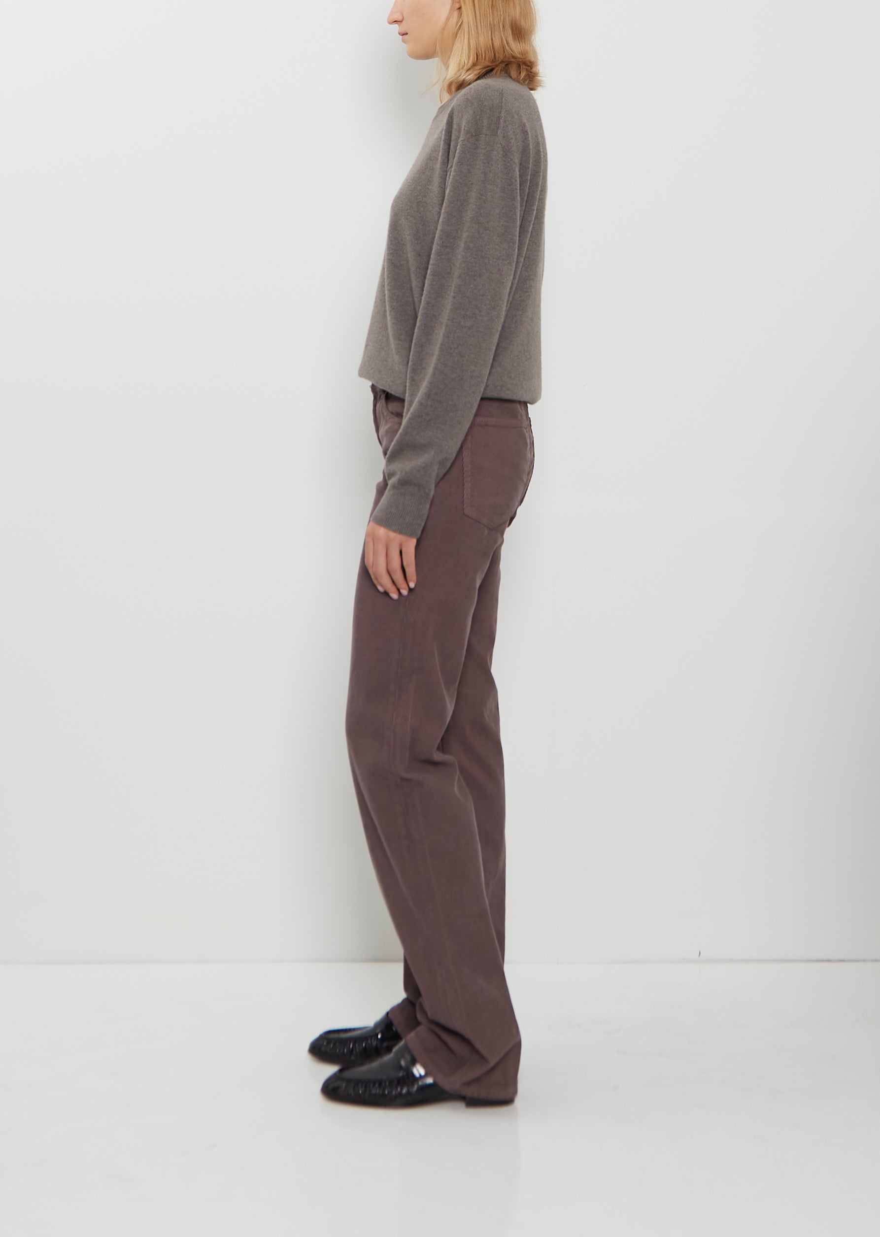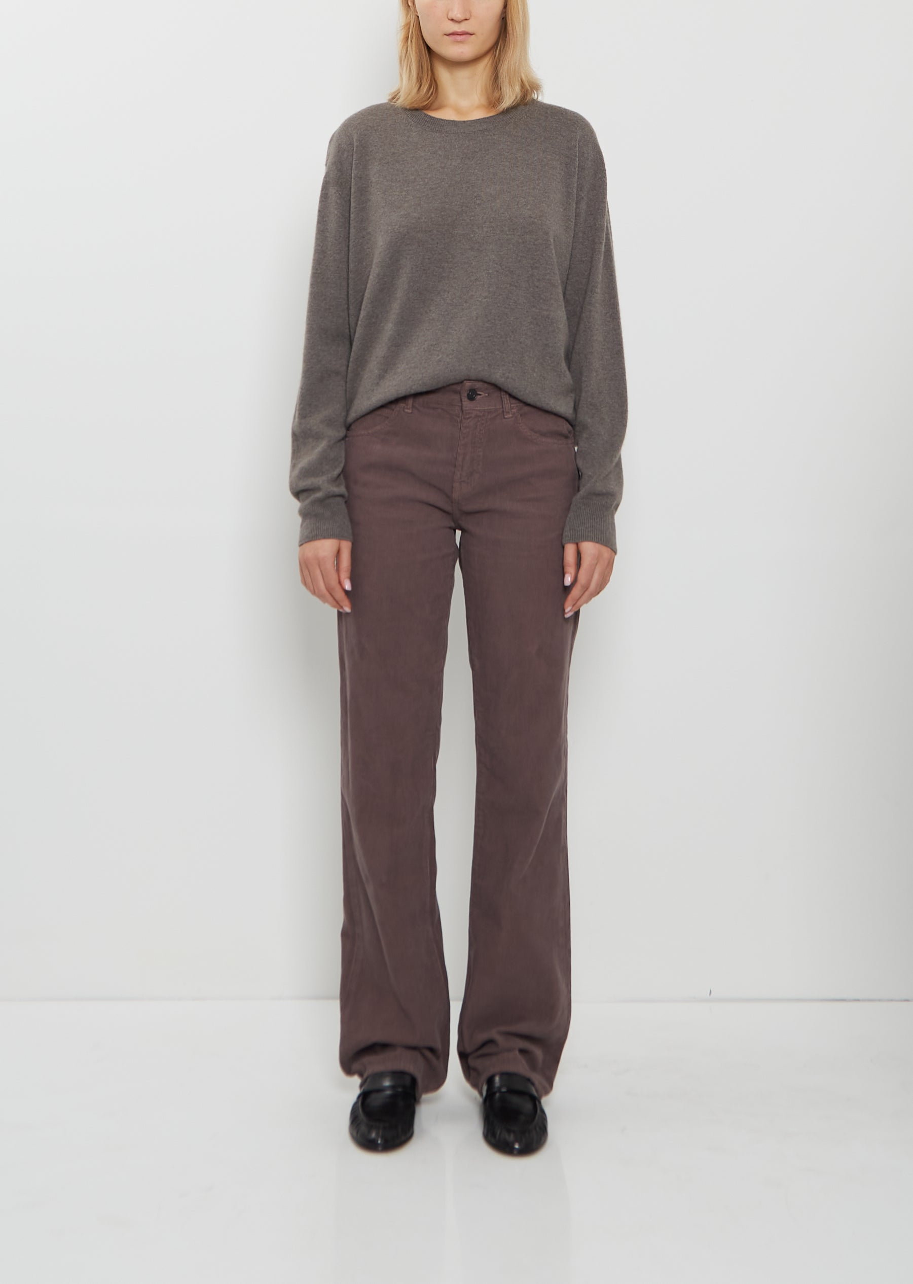 The Row mud brown low-rise pant with slightly flared legs and 5-pocket construction in Japanese cotton corduroy. Features tonal topstitching and a horn button and zip-fly fastening.