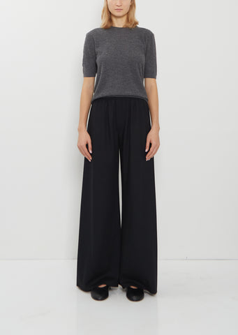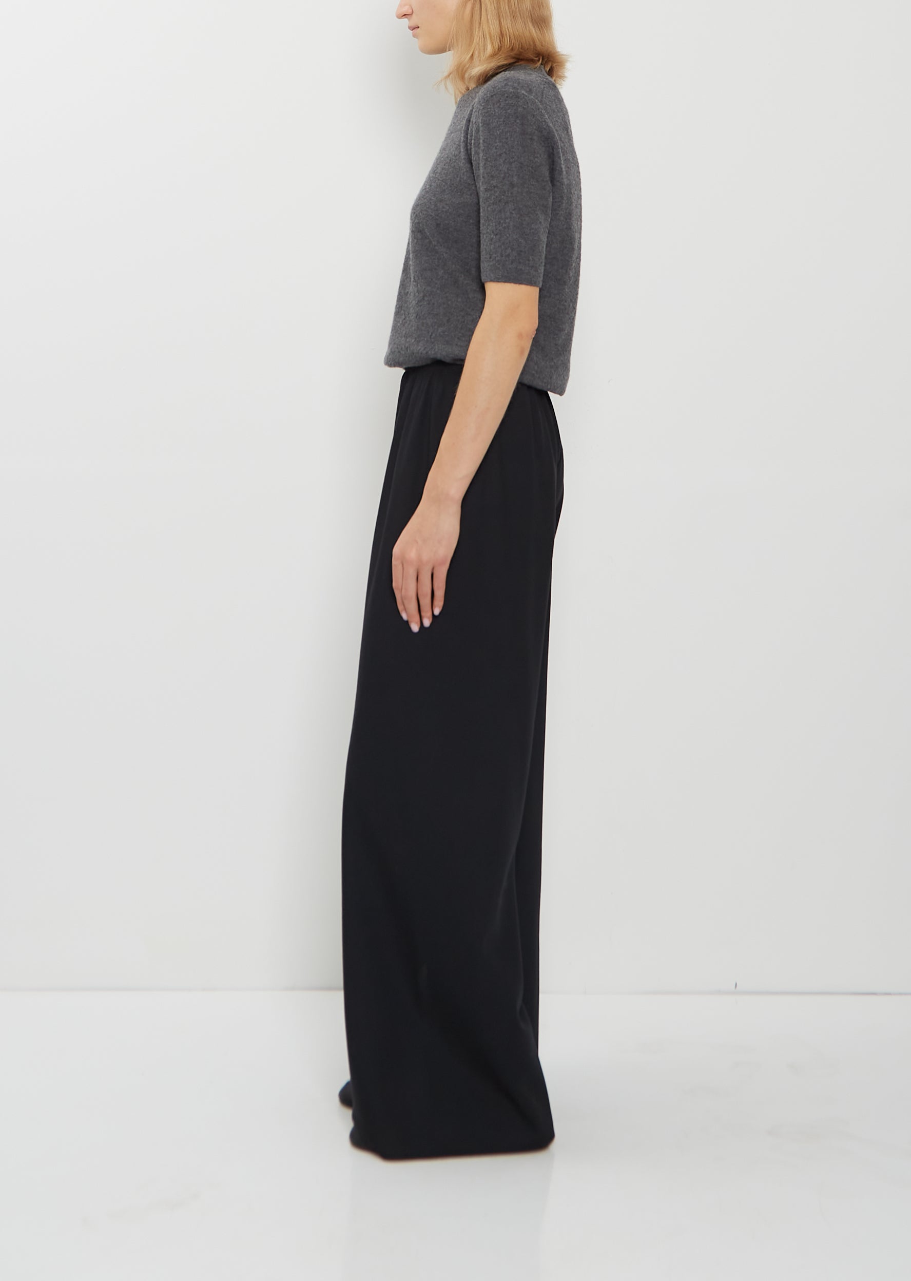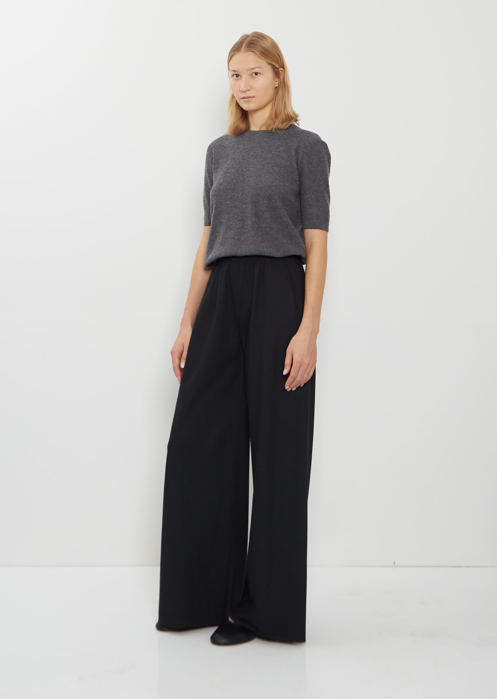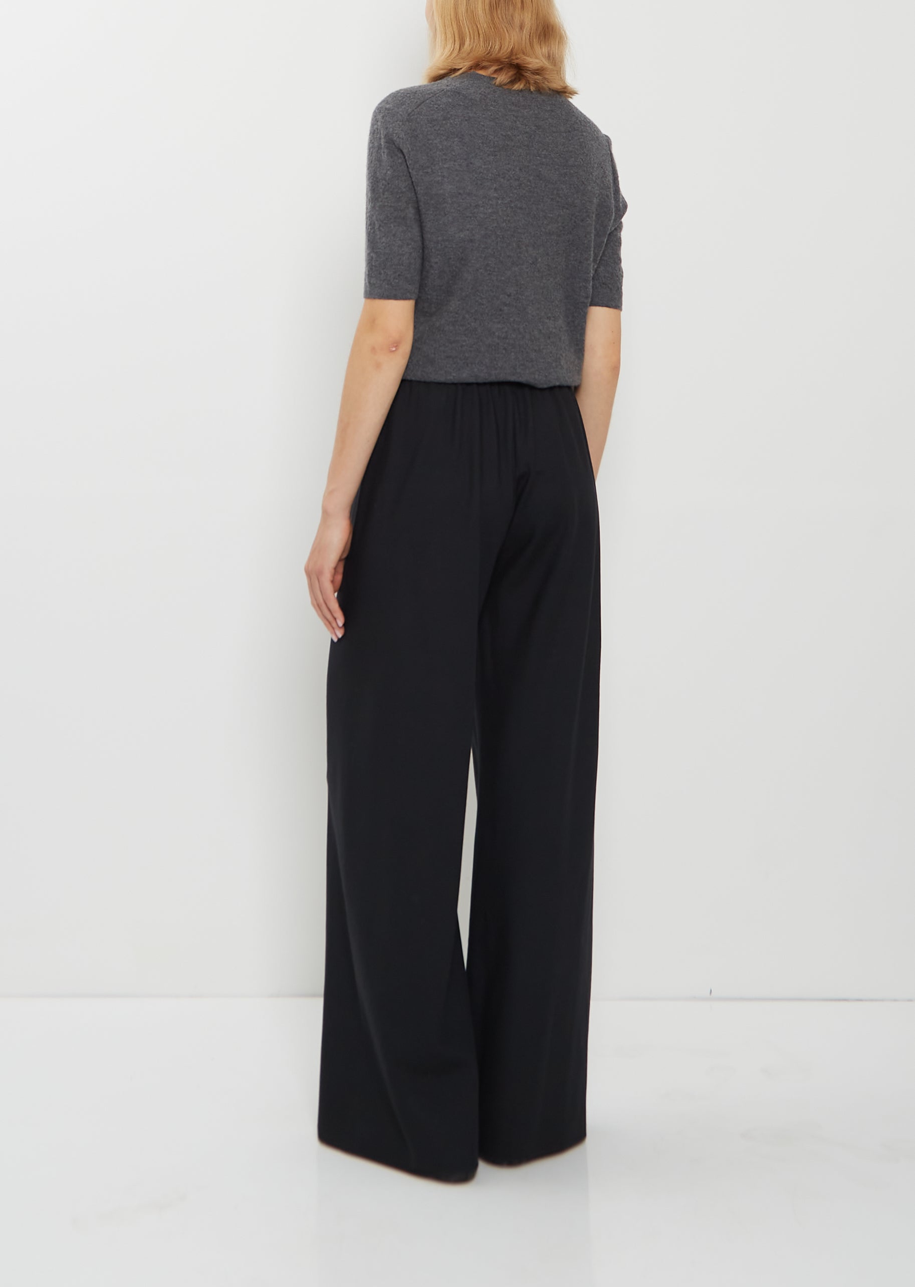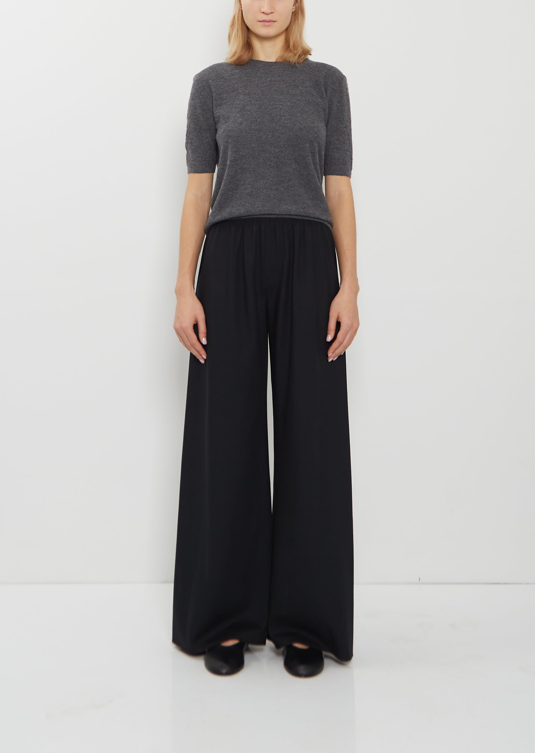 The Row signature pull-on pants with wide legs and a slim gathered elastic waistband in fluid and lightweight wool flannel.