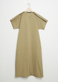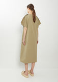 Sofie D'Hoore lentil A-line dress with v-neck in crisp cotton. Features shoulder seam detail with two flaps and invisible side seam pockets. Unlined. Pulls on.