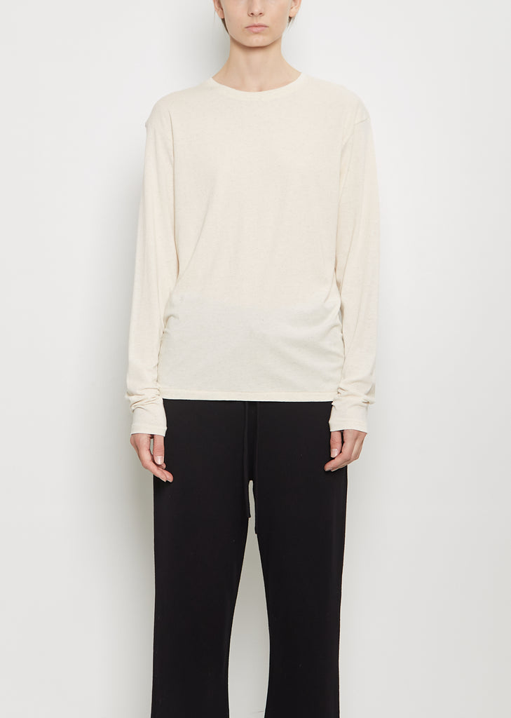 Lauren Manoogian natural long sleeve tee with a crew neckline in a cotton, tencel, and linen blend jersey. Features dropped shoulders, an asymmetrical side seam, and a ribbed trim finish at neckline. Relaxed fit.