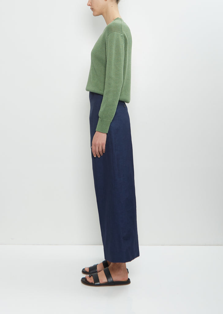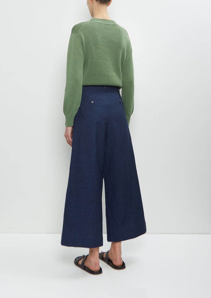 Margaret Howell deep blue culotte trouser with cropped, wide legs in a lightweight English wool and linen blend plainweave. Features belt loops, a flat front, angled side pockets, buttoned welt pockets at back, and concealed button tab zip-fly fastening at side seam. Relaxed fit.