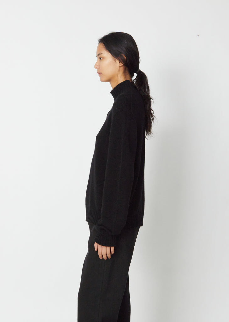 The Row Essentials black sweater in foamy cashmere knit with mock turtleneck and ribbed neckline, cuffs and hem. Also available in heather grey