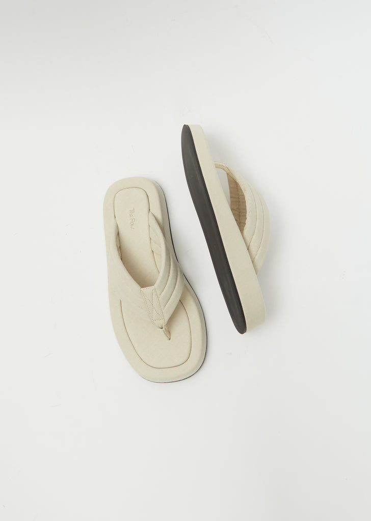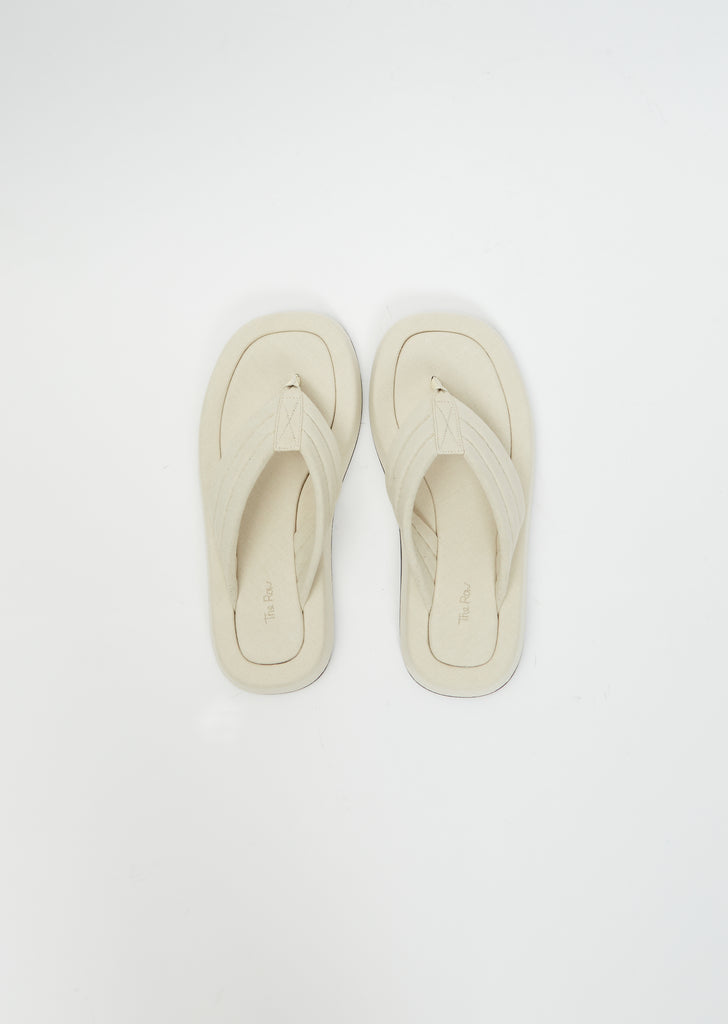 The Row Japanese inspired flip-flop in an ivory cotton and linen with stitch detail on straps and hand-wrapped midsole and footbed.